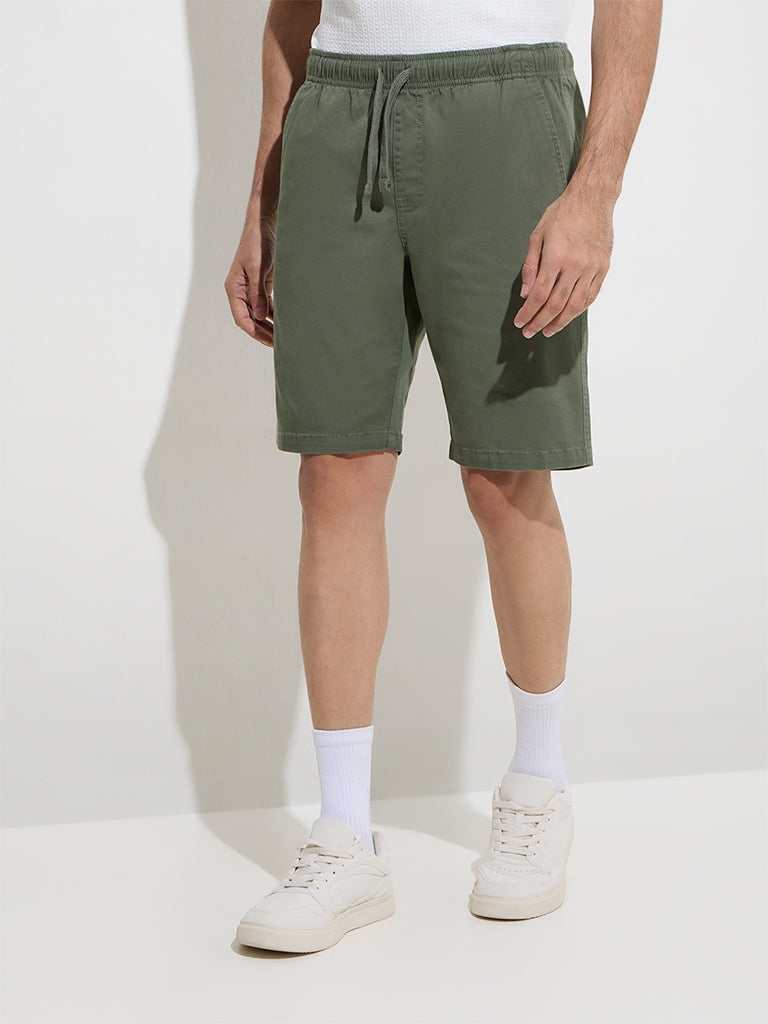 WES Casuals Olive Relaxed-Fit Mid-Rise Cotton-Blend Shorts