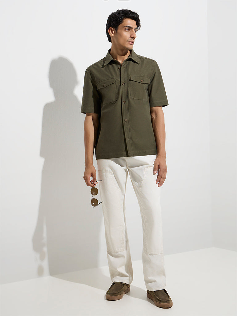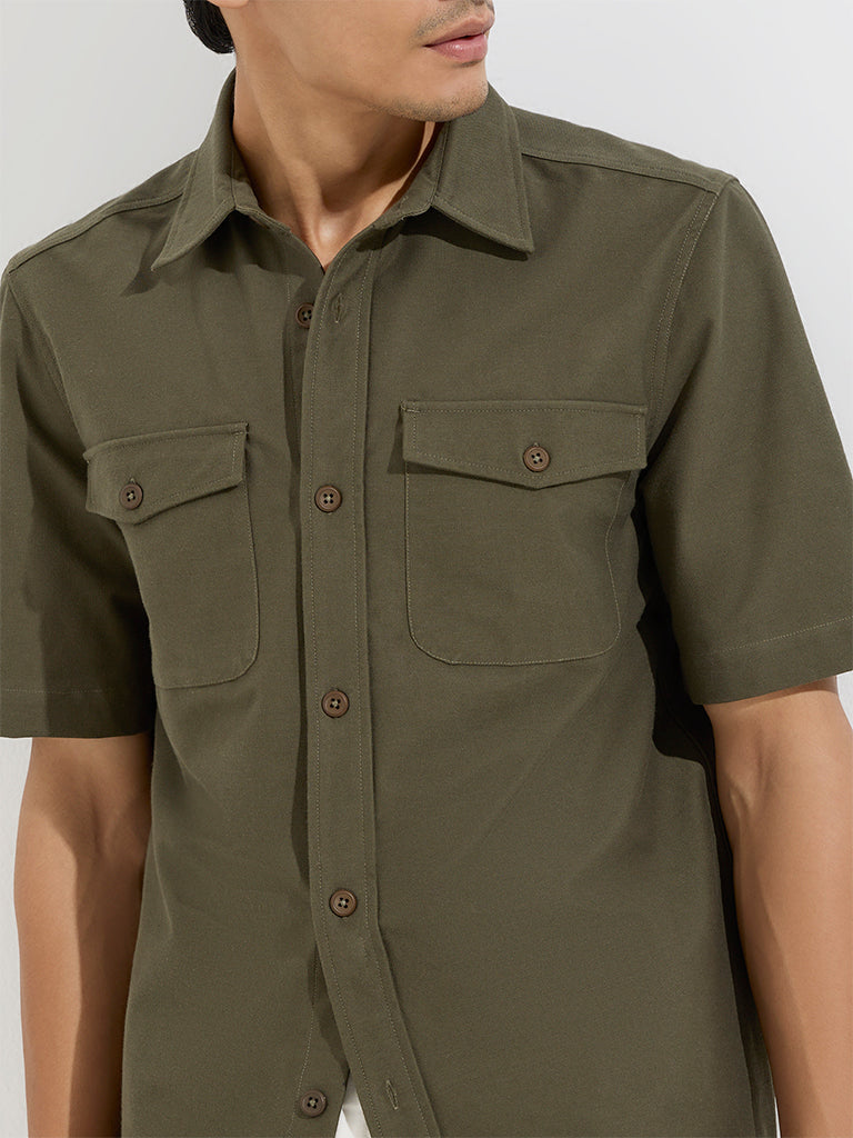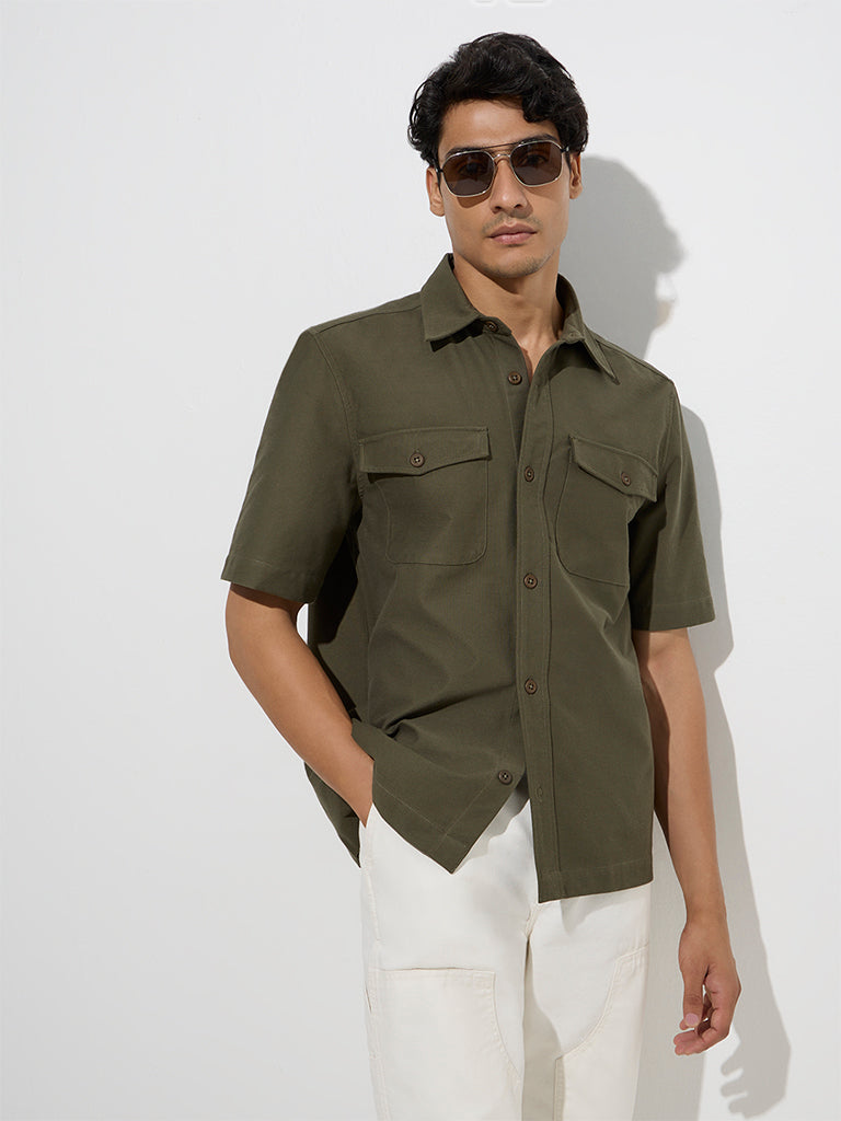 WES Casuals Olive Solid Relaxed-Fit Cotton-Blend Shirt