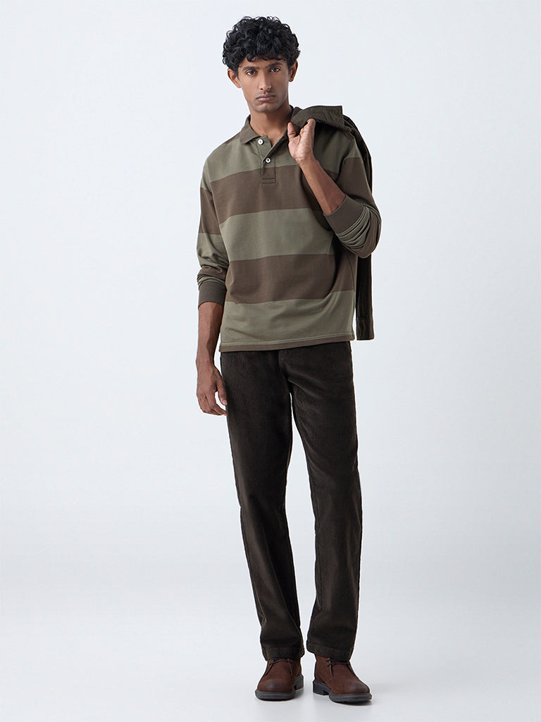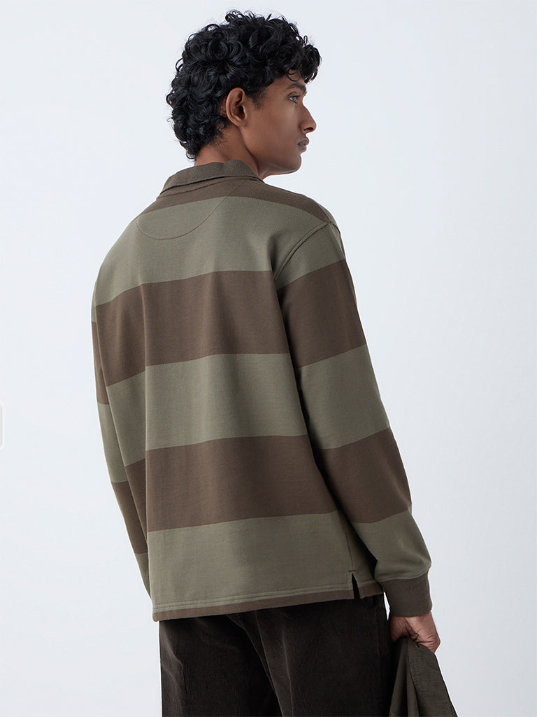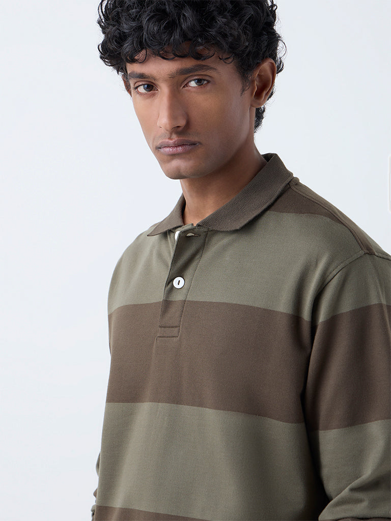 WES Casuals Olive Striped Relaxed Fit Cotton-Blend Polo T-Shirt