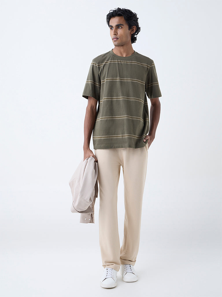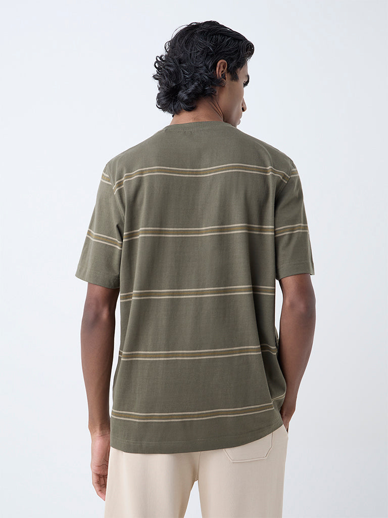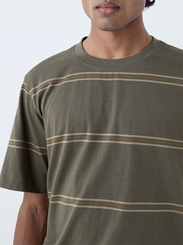 WES Casuals Olive Striped Relaxed-Fit Cotton T-Shirt
