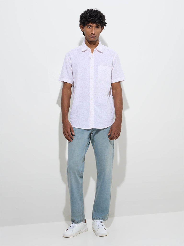 This pink shirt from WES Casuals showcases delicate floral prints. Tailored in a relaxed silhouette. it offers an effortless blend of style and comfort. Crafted from a breathable cotton-linen blend. it features a spread collar. a button-up front. and half sleeves. while a functional front pocket adds practicality.