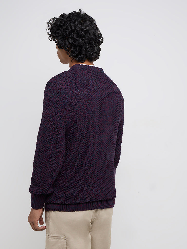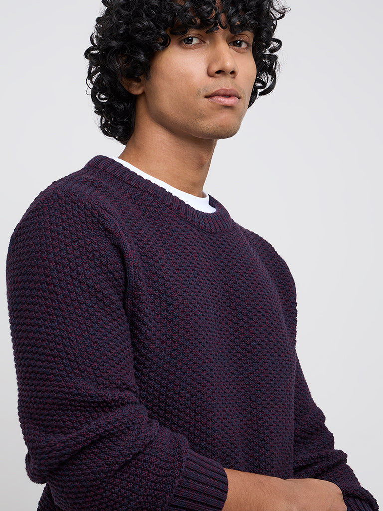 WES Casuals launches this purple sweater knitted into captivating popcorn texture. Crafted with warm and breathable fabric. the winter wear garment includes a round neck and full sleeves.