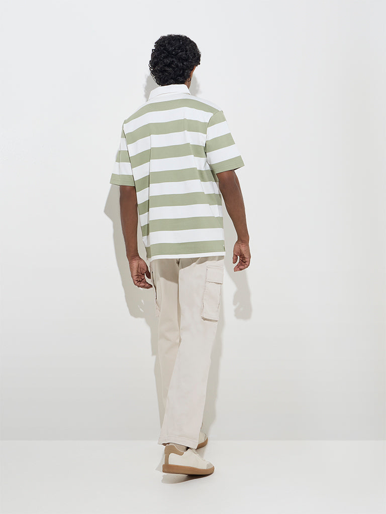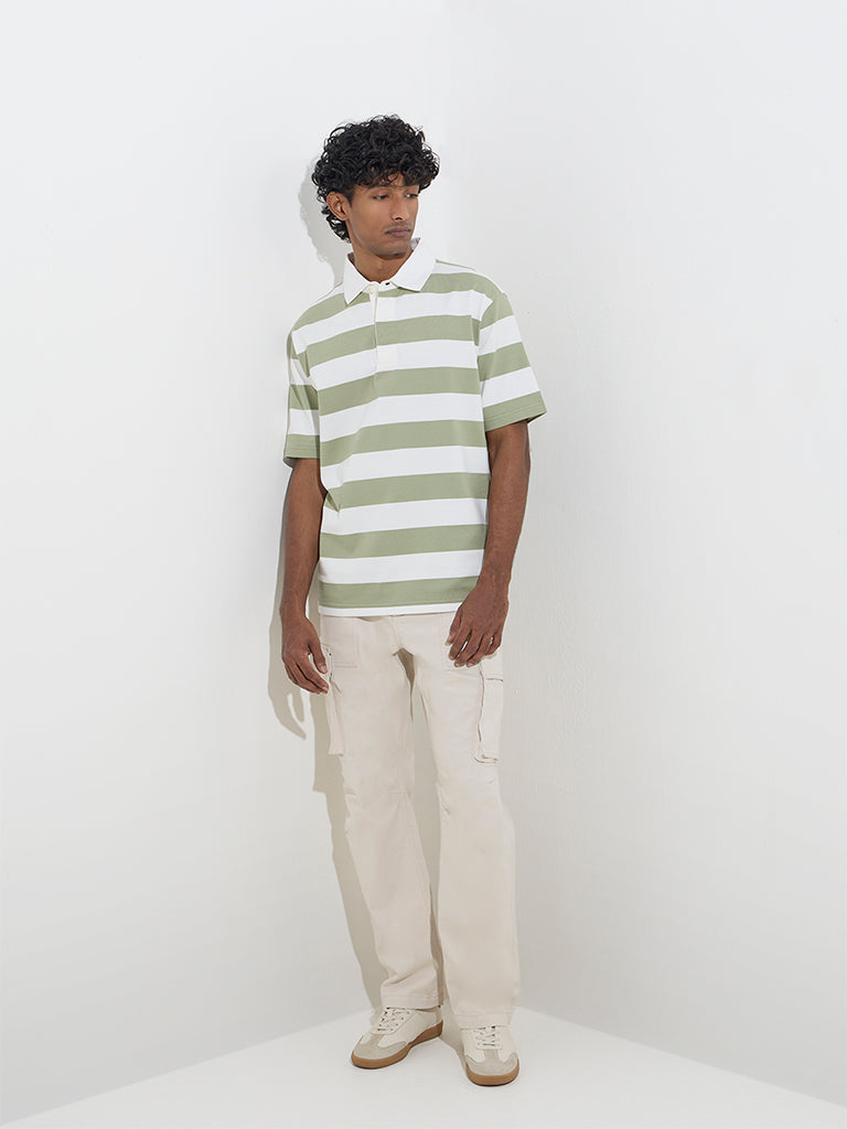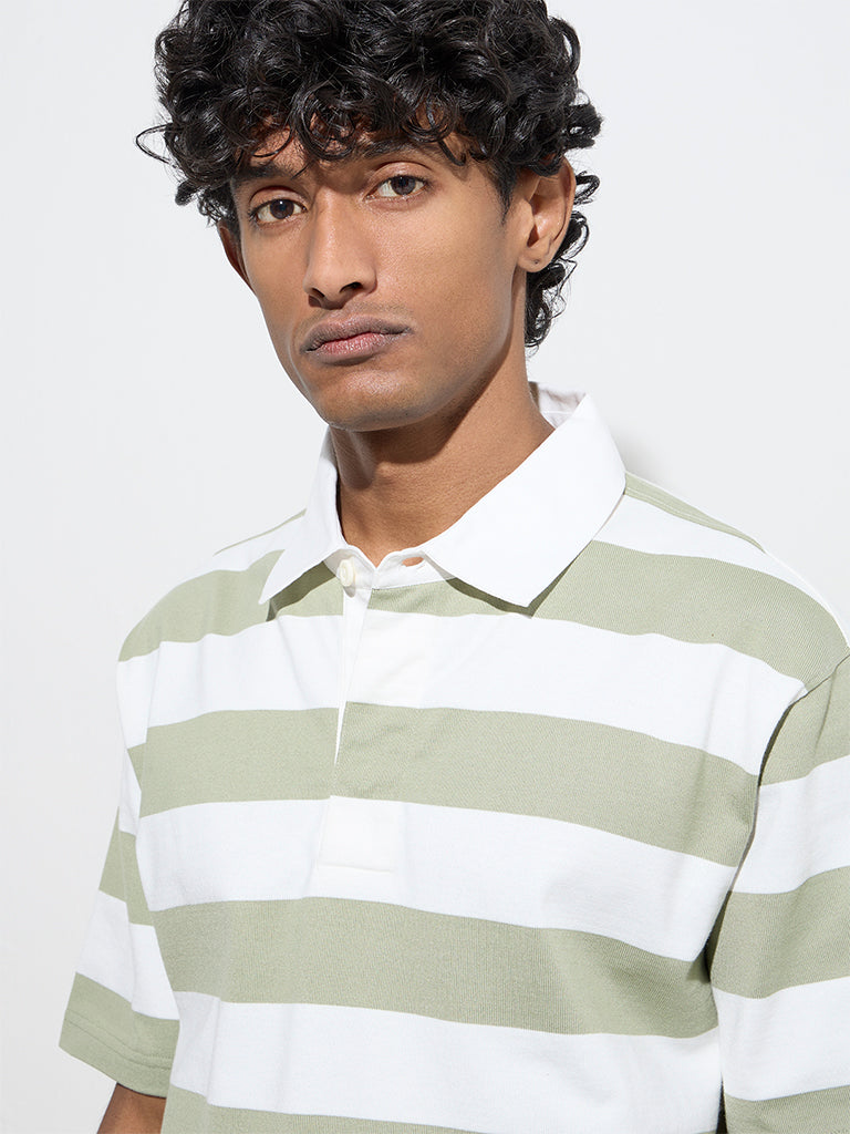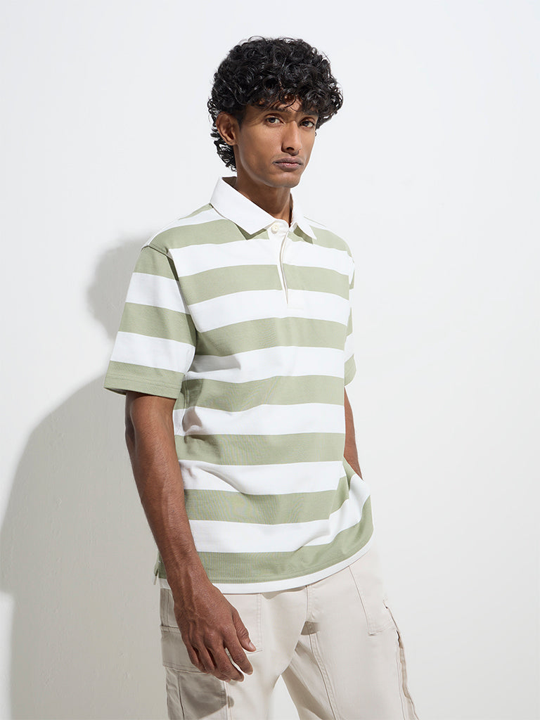 Defined with stripes. this sage polo t-shirt by WES Casuals is cut in a relaxed frame for easy movement. It is crafted from a cotton-blended fabric and features a classic collar. a brief button placket. and half sleeves.