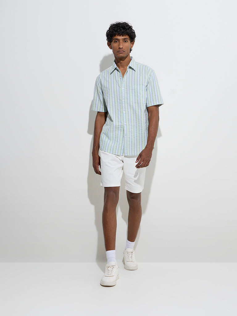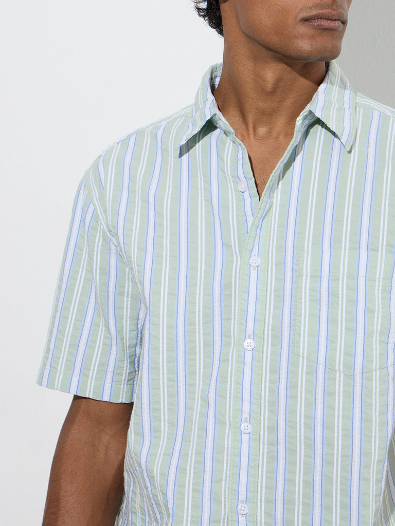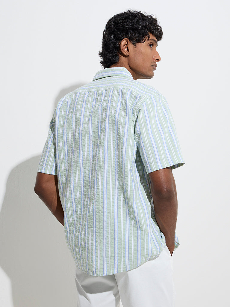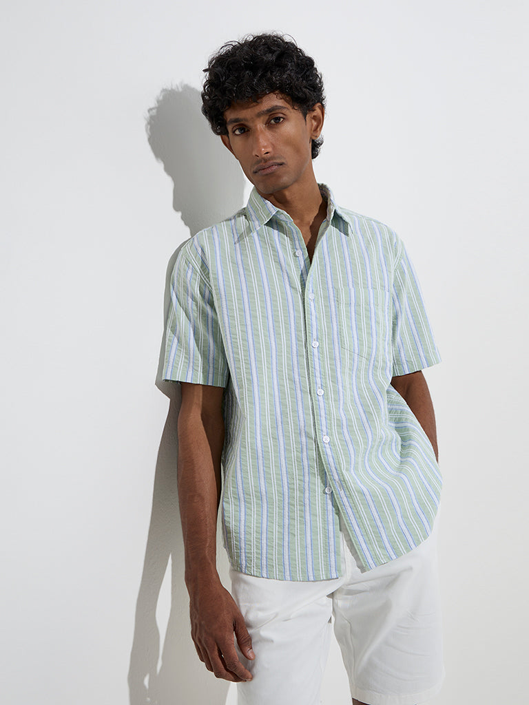 This sage shirt from WES Casuals is adorned with striped prints. Crafted from a luxurious cotton-linen blend. it is tailored in a relaxed fit for breathable comfort. The spread collar. button-up front. and half sleeves enhance its laid-back appeal. while a functional chest pocket adds a practical touch.