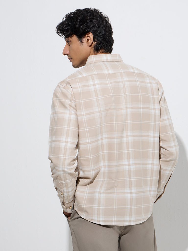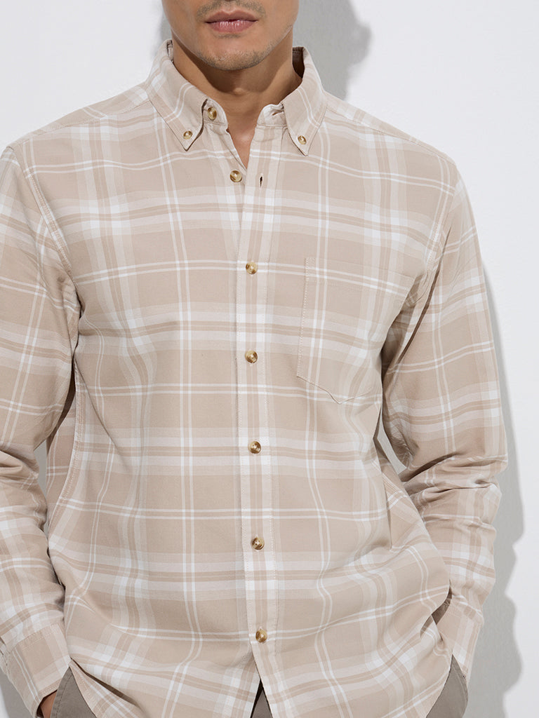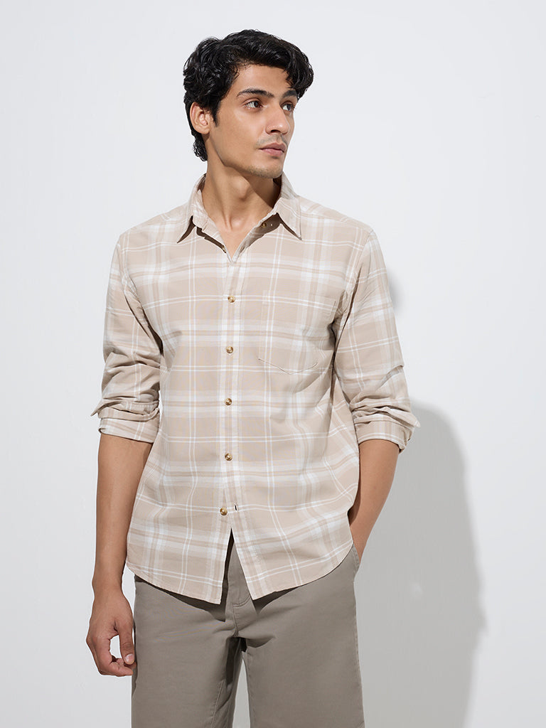 WES Casuals Taupe Checkered Relaxed-Fit Cotton Shirt