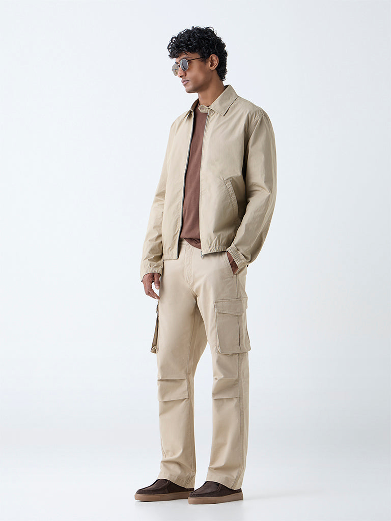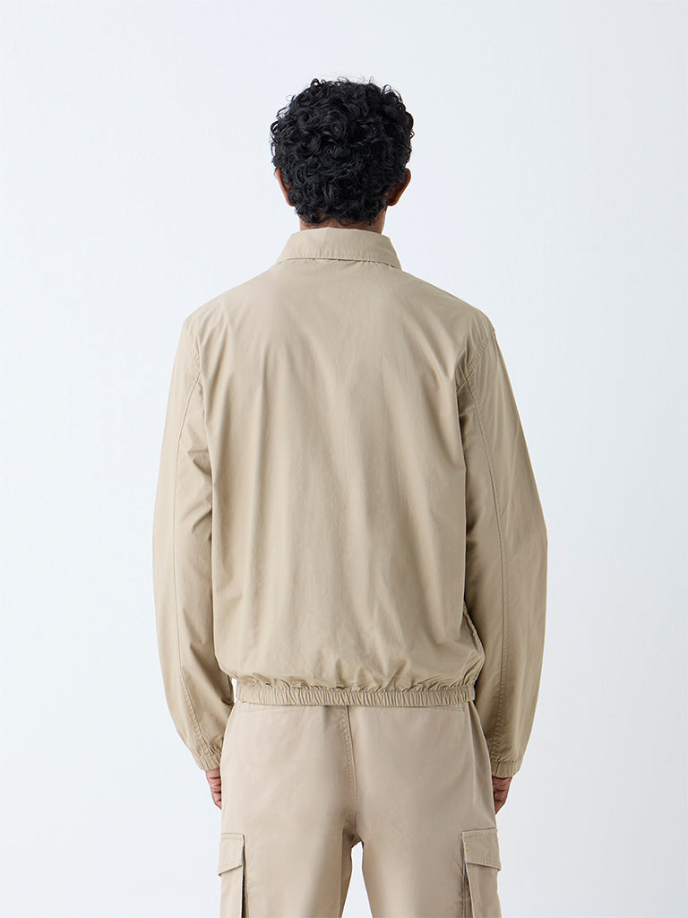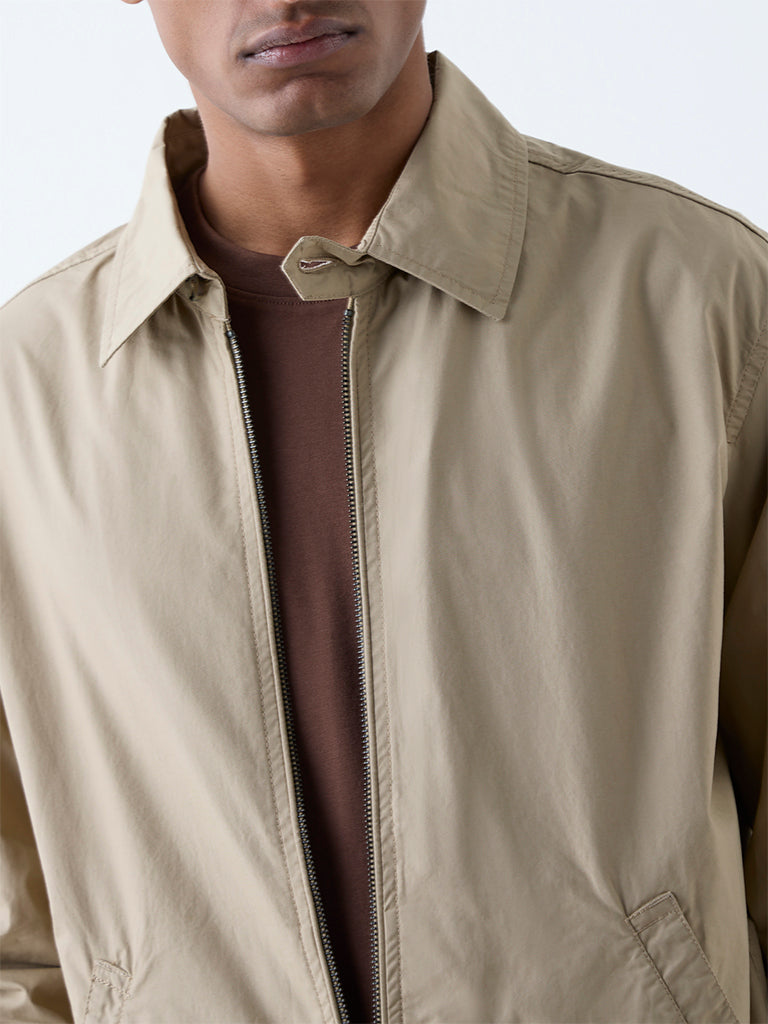 From commute to coffee. this taupe jacket from WES Casuals keeps pace. Milled from pure cotton in a solid profile. it features a cutaway collar with a zipper placket. full sleeves. and welt pockets. An elasticated waistband keeps the fit secure and comfortable. making it an easy layer for everyday rotation.