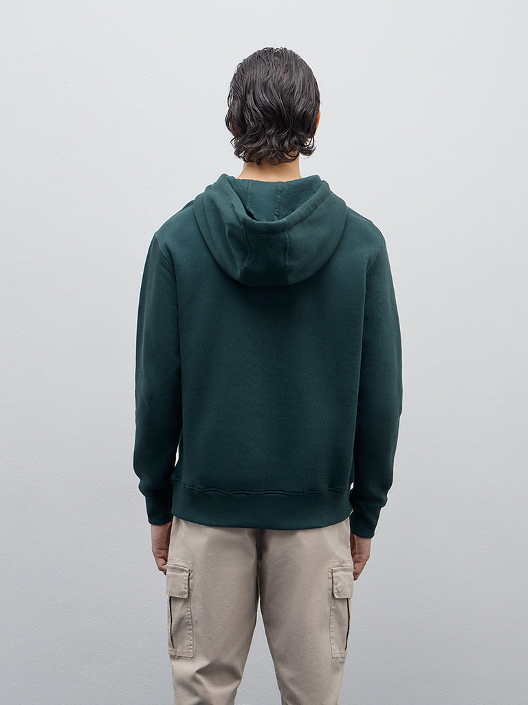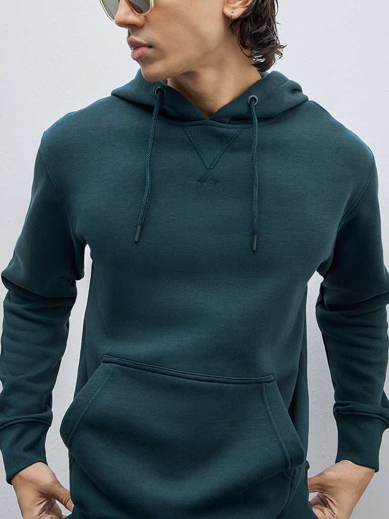 Flaunting a solid design. this teal sweatshirt by WES Casuals comes with a hooded neck. It is crafted from a comfy cotton-blend material featuring full sleeves. kangaroo pockets and an elasticated hem for superior comfort.