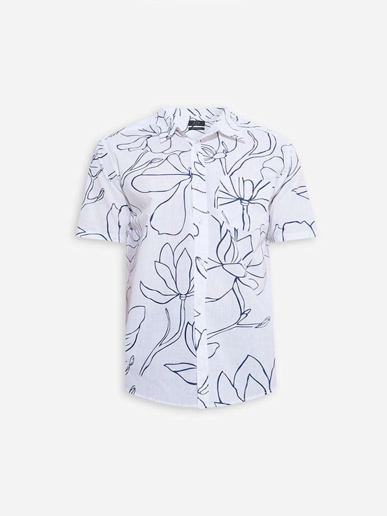 WES Casuals White Floral Design Relaxed-Fit Cotton Shirt