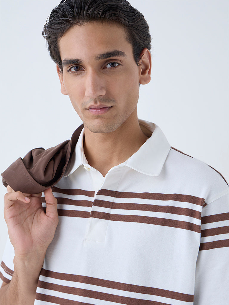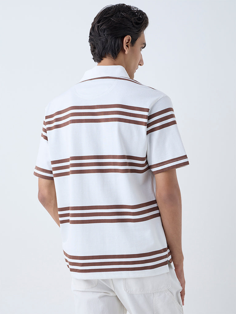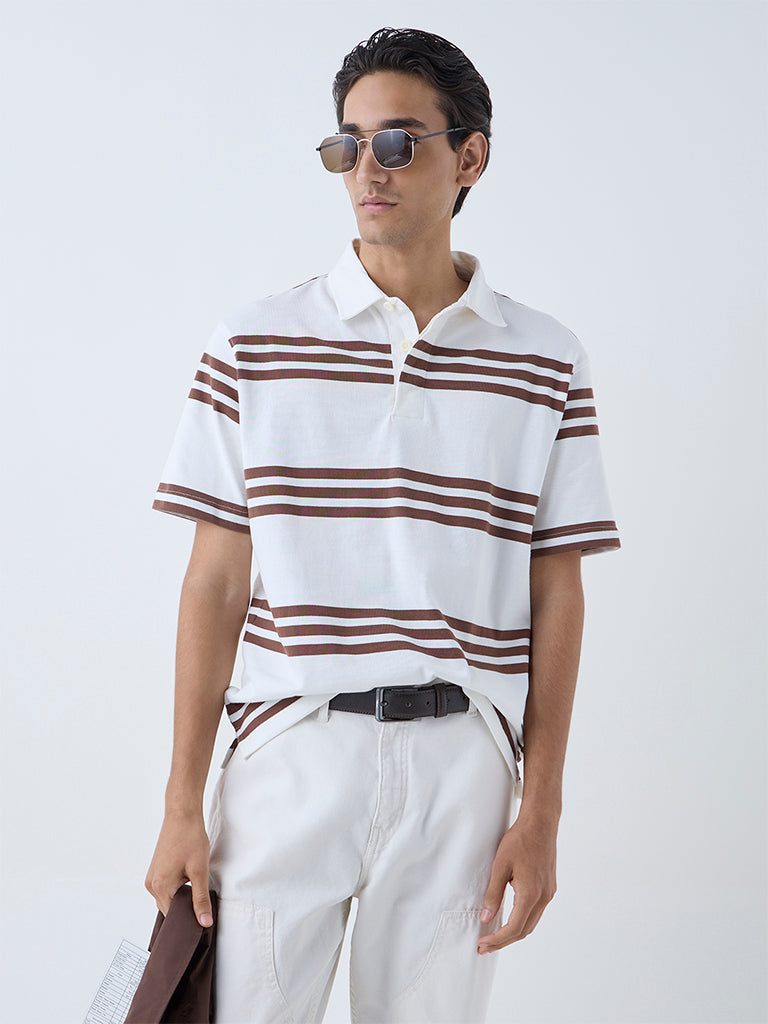 This white polo t-shirt from WES Casuals is made for weekend getaways. Woven from a soft cotton-blend material. it features a quarter button placket. half sleeves. and a structured collar for all-day comfort. The striped motifs add a touch of classic style.