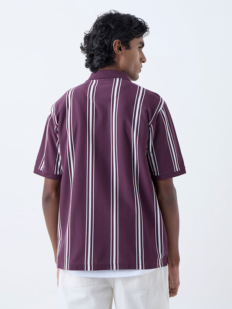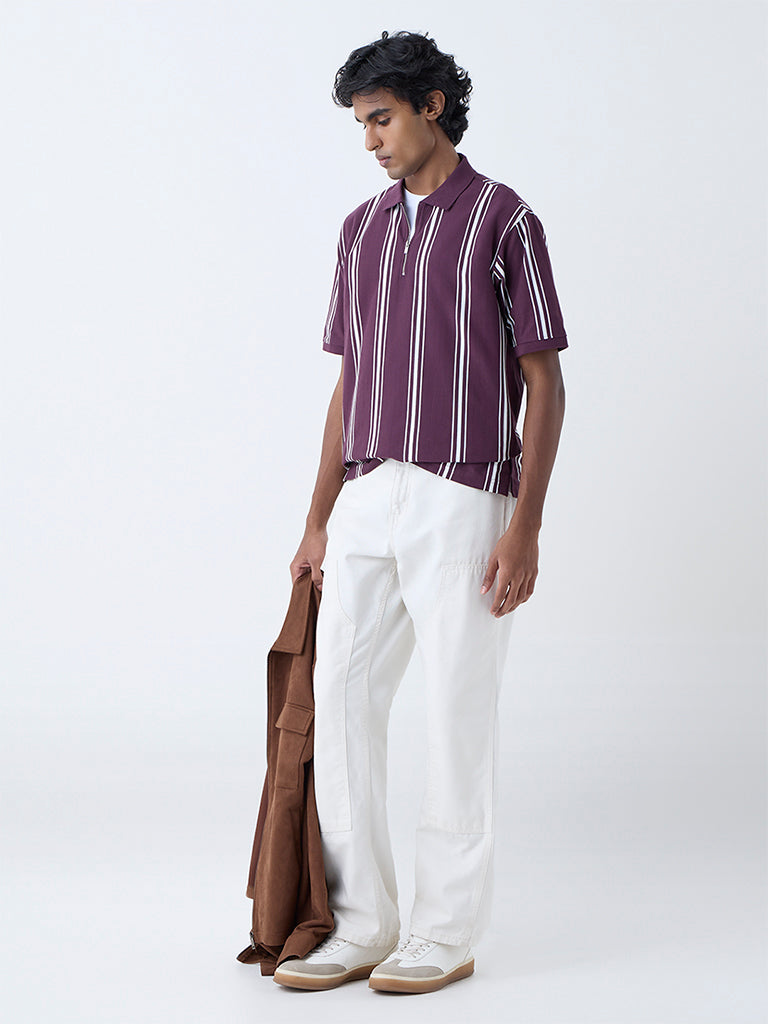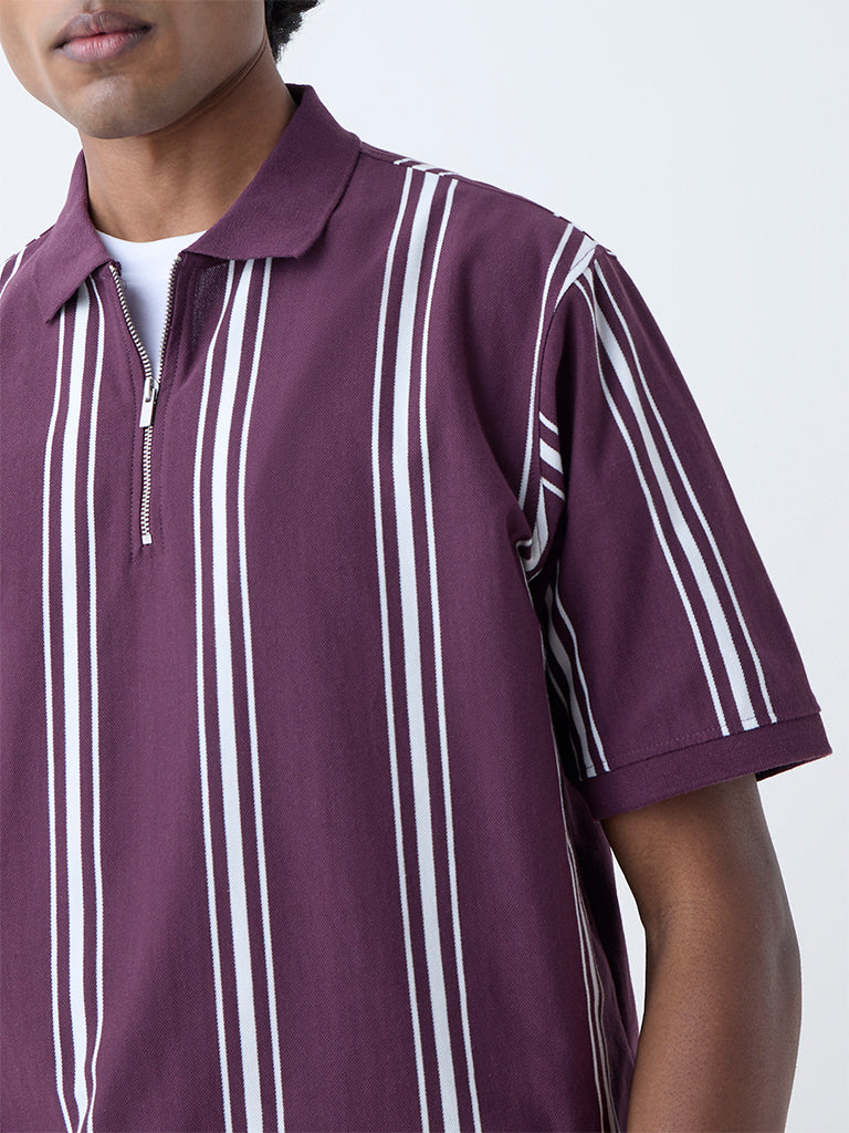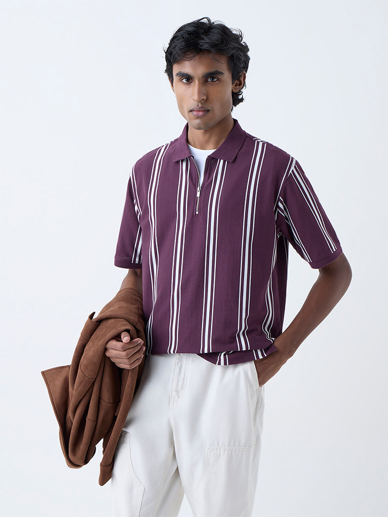 Add a contemporary twist to casual wear with this wine polo tee from WES Casuals. Defined by bold stripes. it features a collar with a zip fastening and short sleeves. all tailored in a relaxed fit. Designed for comfort and style. it brings an athletic-inspired finish to everyday looks.