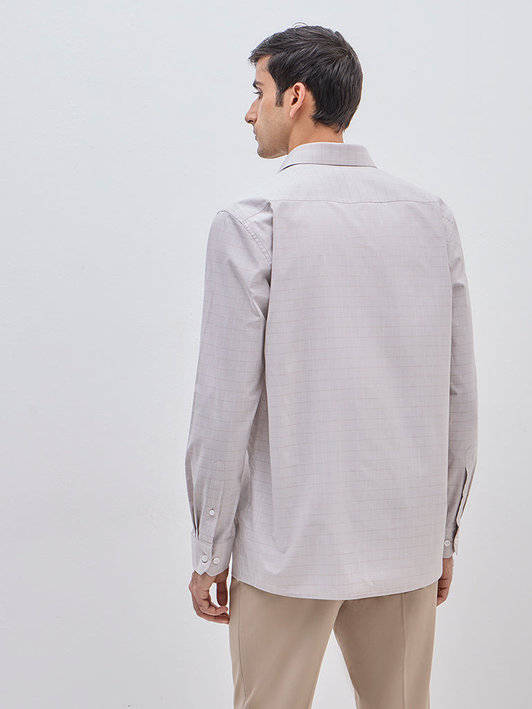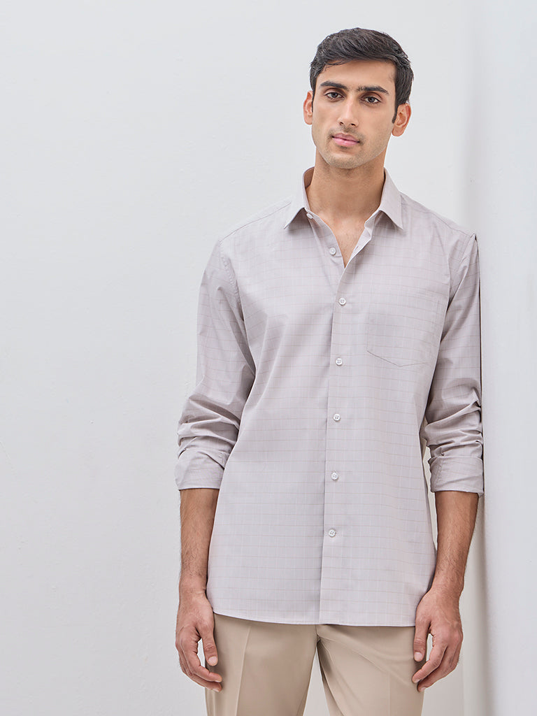 This beige shirt from WES Formals highlights checkered prints. Crafted from a cotton-rich fabric. the relaxed-fit separate includes a classic collar. button placket. full sleeves. and chest pocket.