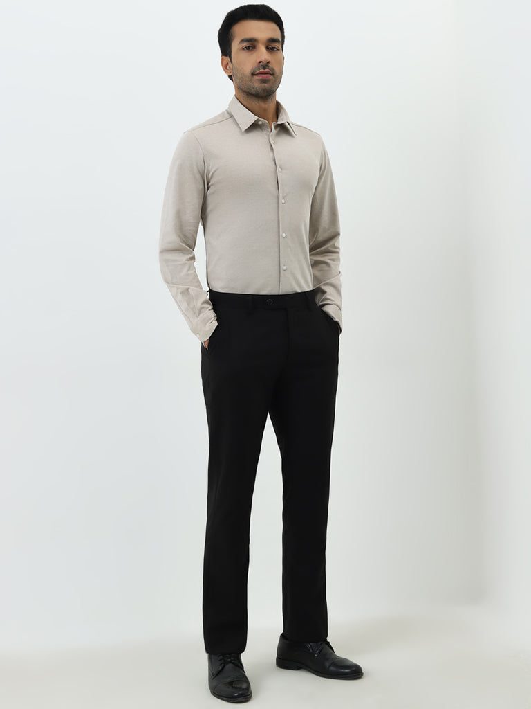 WES Formals presents this beige shirt in a slim-fit cut. Crafted with soft and stretchable fabric. the formalwear carries a collared neck. button down front and full sleeves.