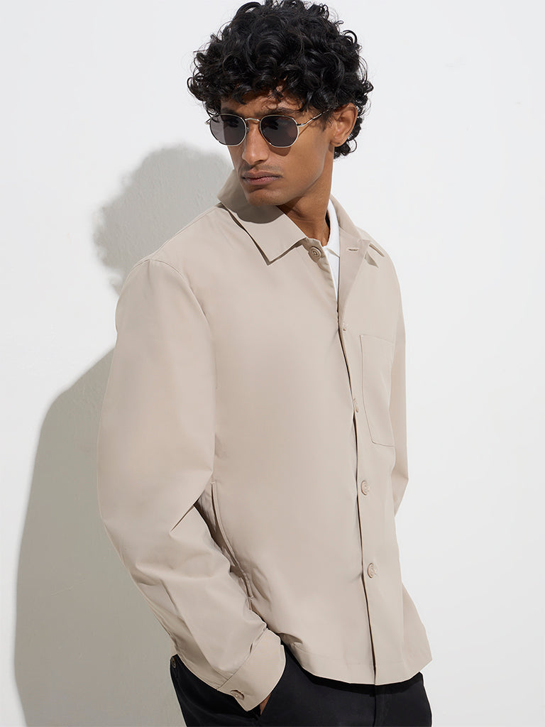 Structured in a relaxed fit. this beige jacket from WES Formals is crafted from premium-quality fabric for versatile styling. It features a spread collar. full sleeves. a button placket. and a chest pocket that lend a contemporary edge to the overall design.