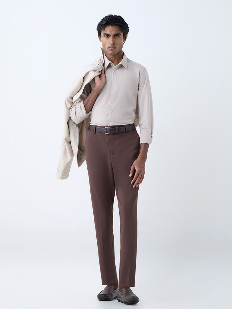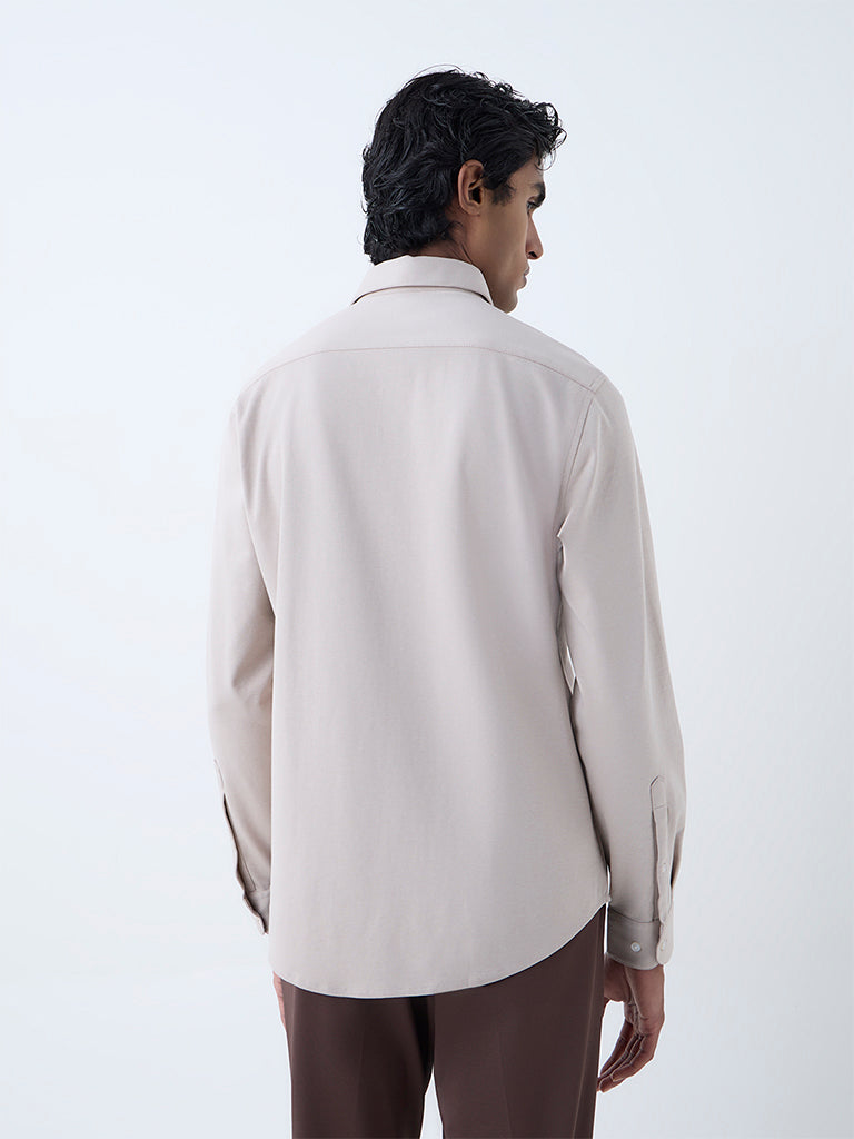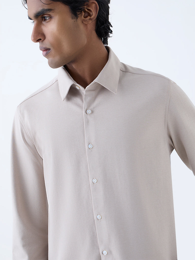 WES Formals Beige Solid Slim-Fit Cotton-Blend Shirt