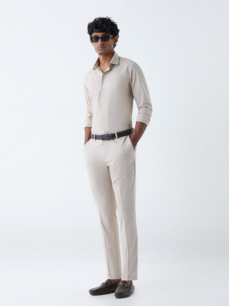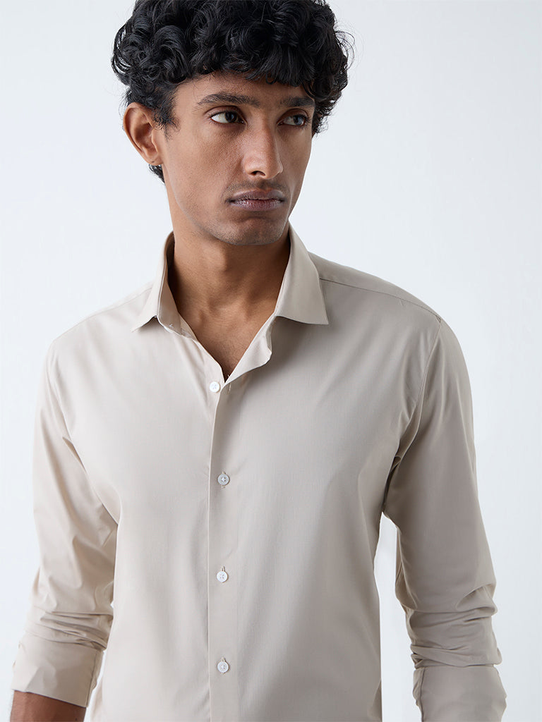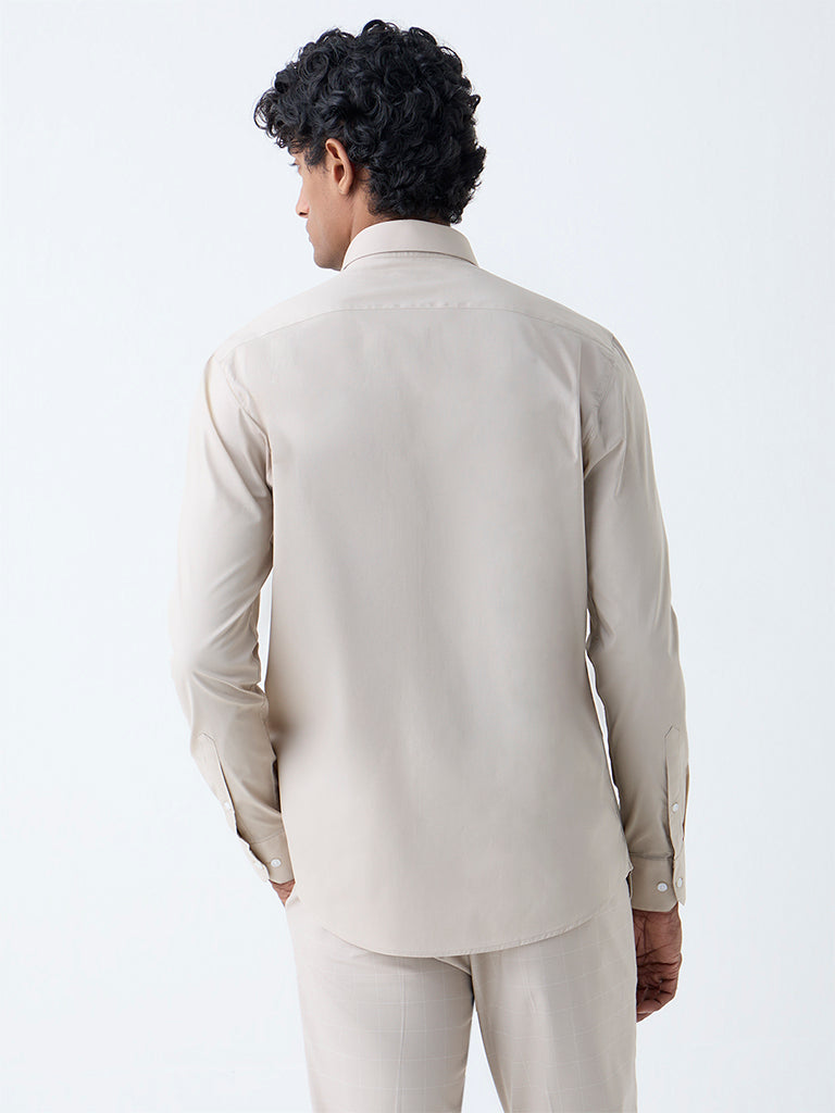 WES Formals Beige Solid Ultra-Slim Fit Cotton-Blend Shirt