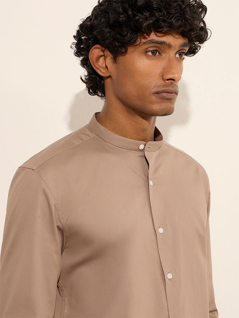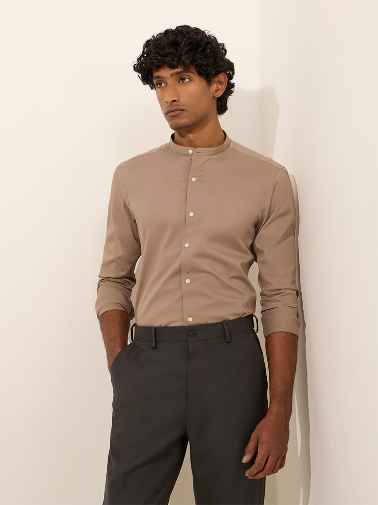 Beige shirt from WES Formals fashioned in a minimalistic profile. Milled from a cotton-blend fabric. the ultra-slim fit creation is fitted with a mandarin collar that extends to a button placket and full sleeves.