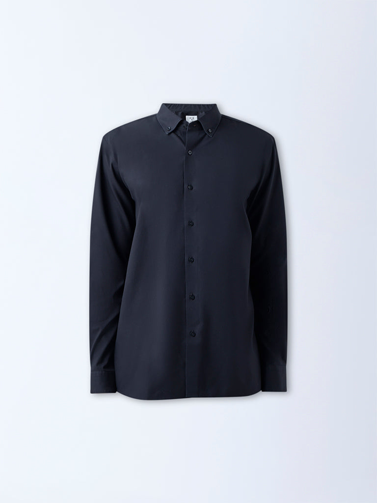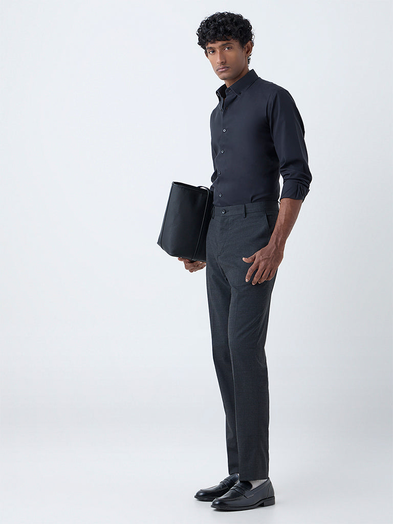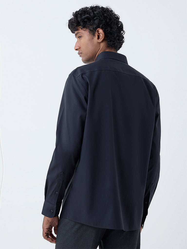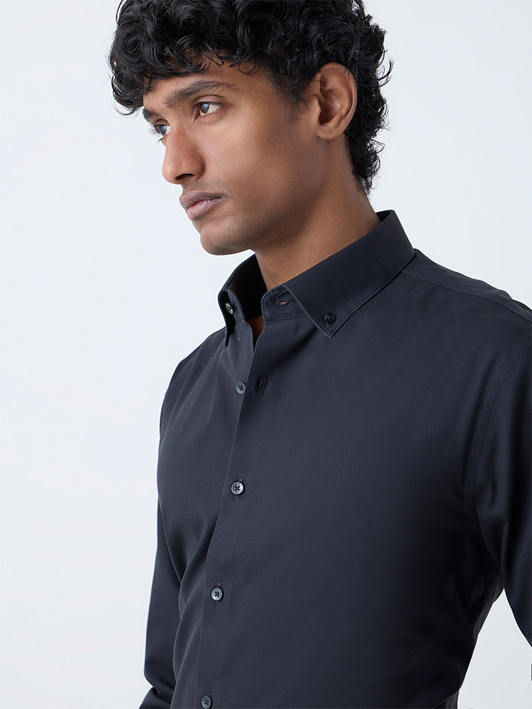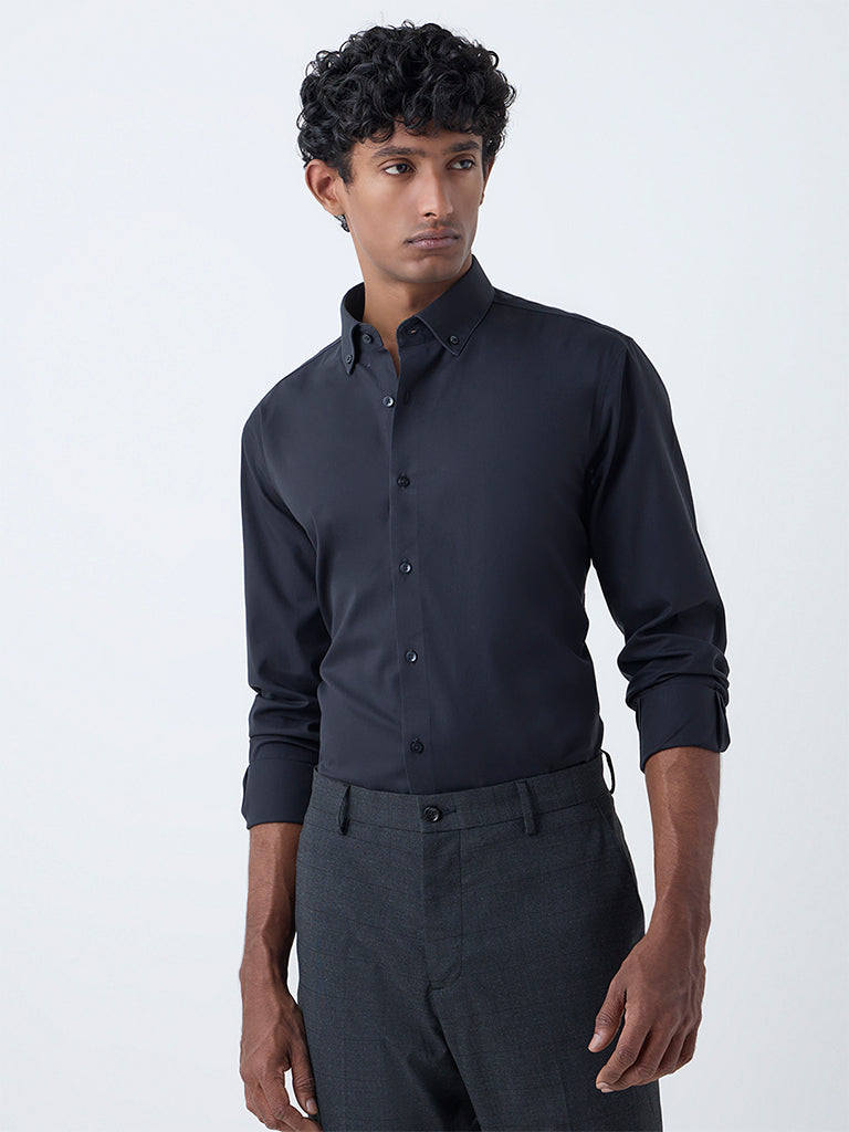 Bring a composed edge to your work wardrobe with this black shirt from WES Formals. Built in a slim-fit silhouette from cotton-rich fabric. it offers a structured yet comfortable feel. Designed with a button-down collar and full sleeves. it’s a reliable choice for a neat. professional look.