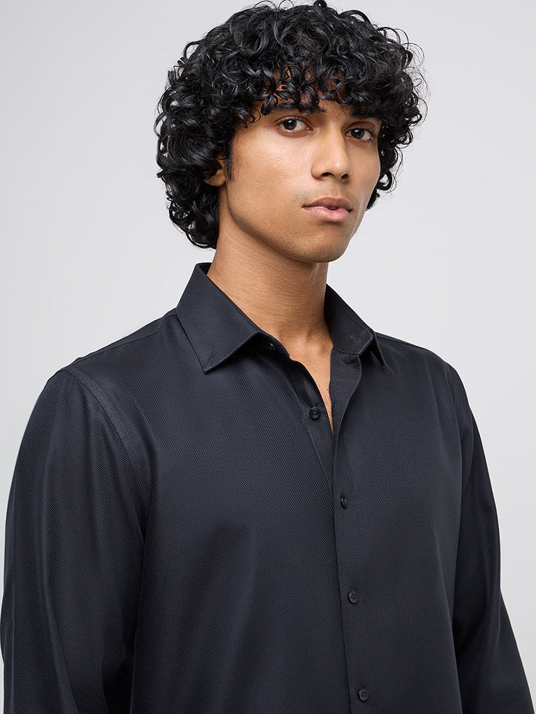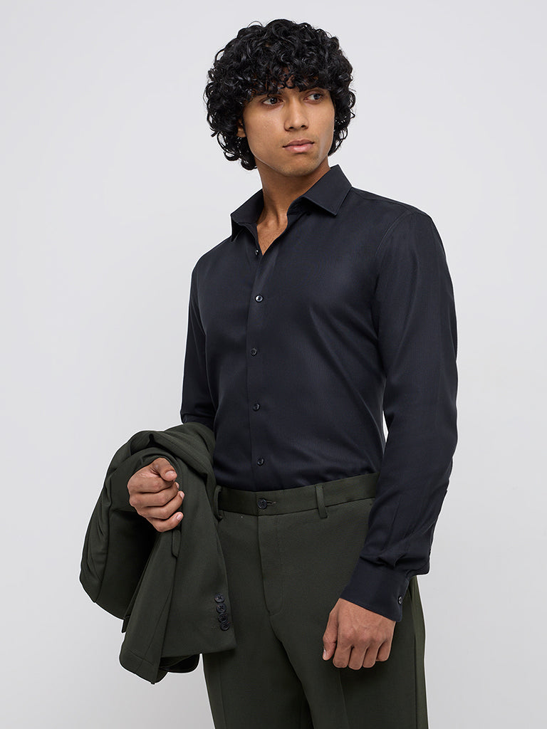 This black shirt by WES Formals is cut in a slim-fit frame. Spun in pure cotton. it includes a button collar. button down front and full sleeves.