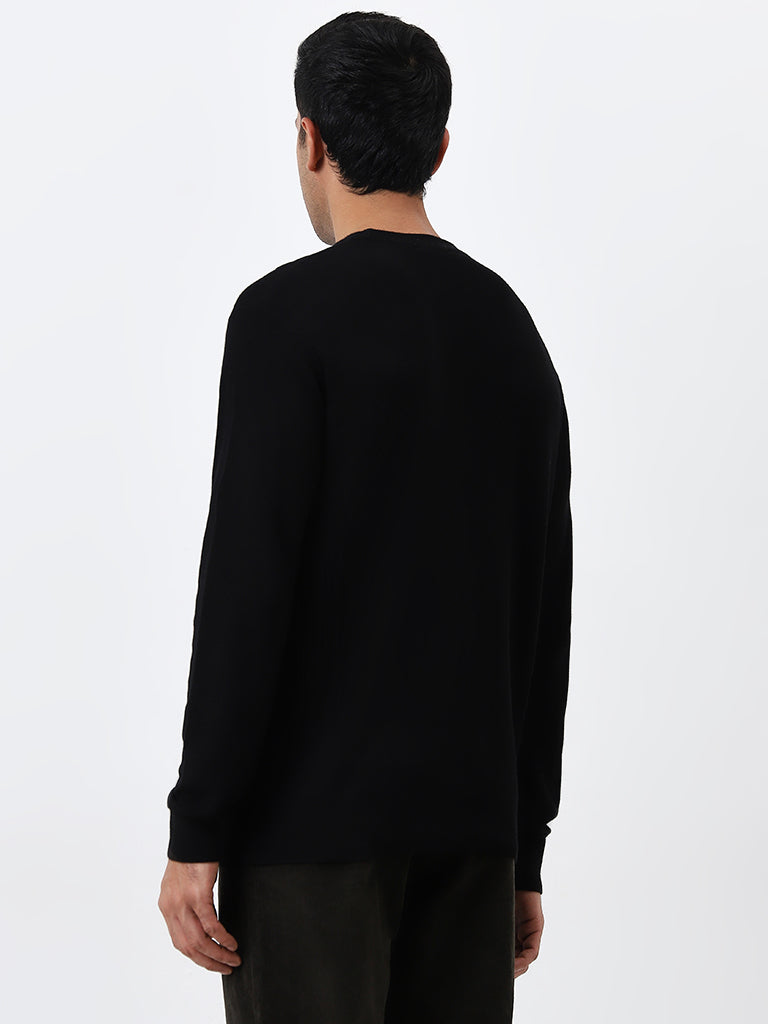 This black sweater by WES Formals features a textured design in a slim fit. Fabricated from an insulated fabric. this sweater ensures a cosy feel with its ribbed crewneck and full sleeves.