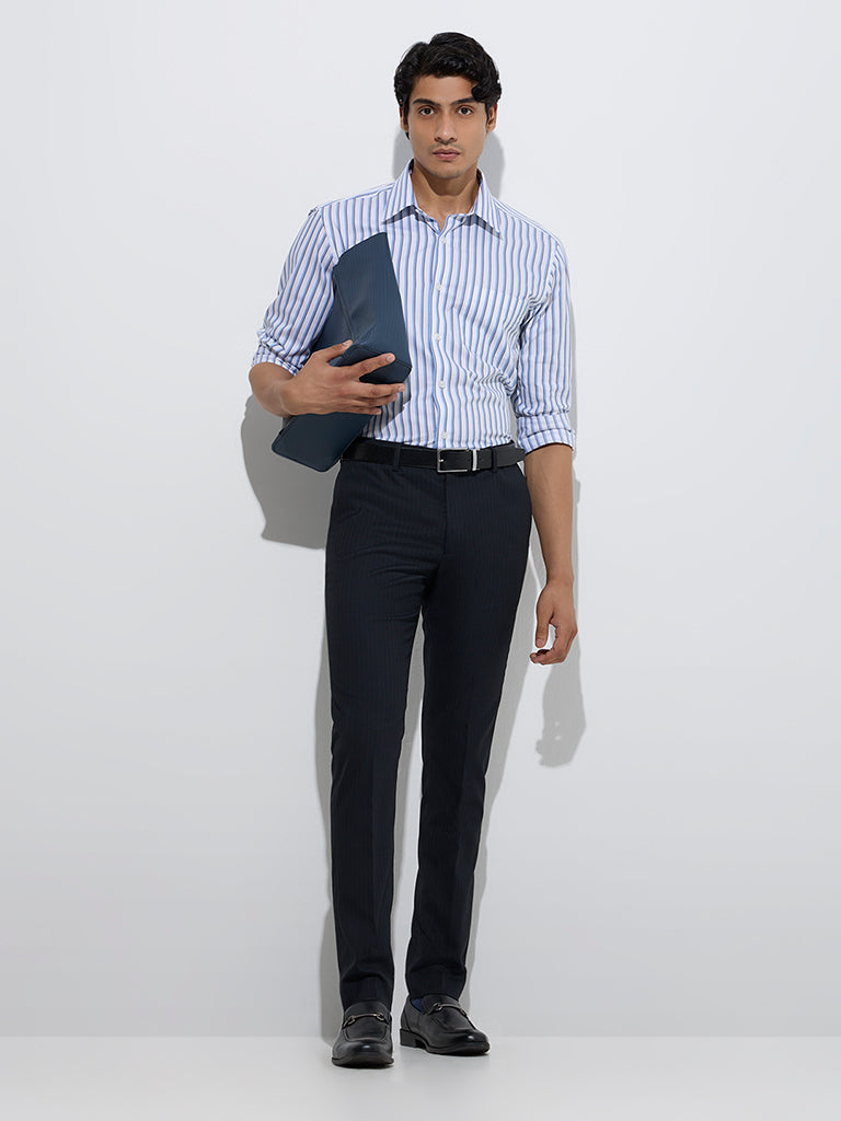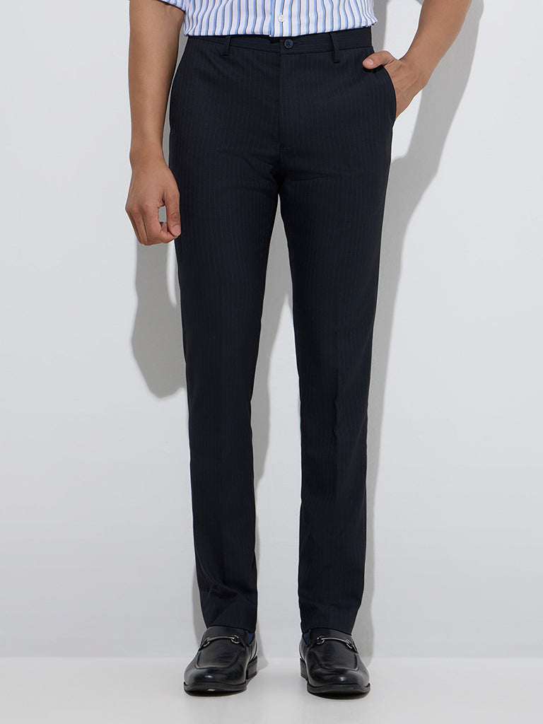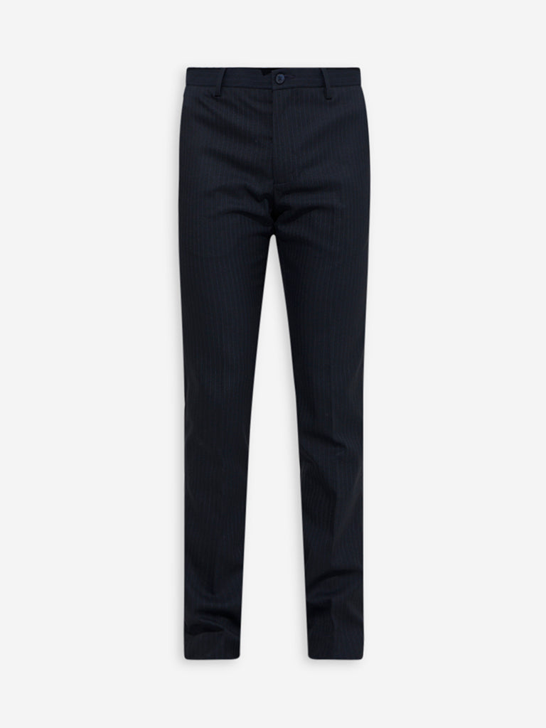 These black trousers from WES Formals are fashioned with a pinstripe pattern and are tailored in an ultra slim-fit silhouette. Finished with a buttoned waistband. belt loops. a zipper fly. and multiple pockets. they make a smart choice for your everyday office ensembles.
