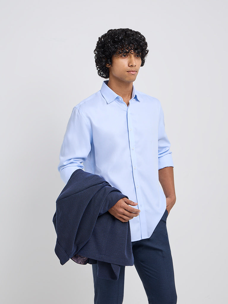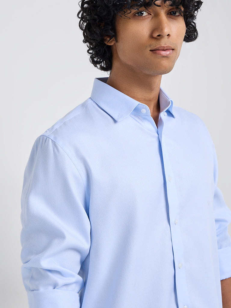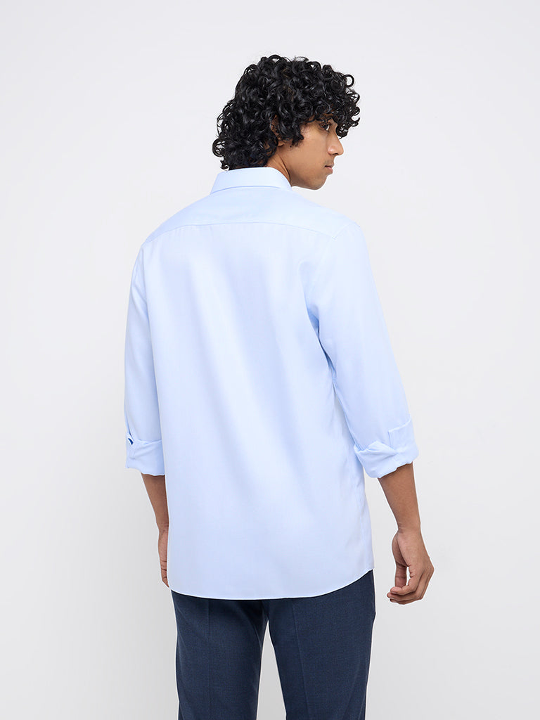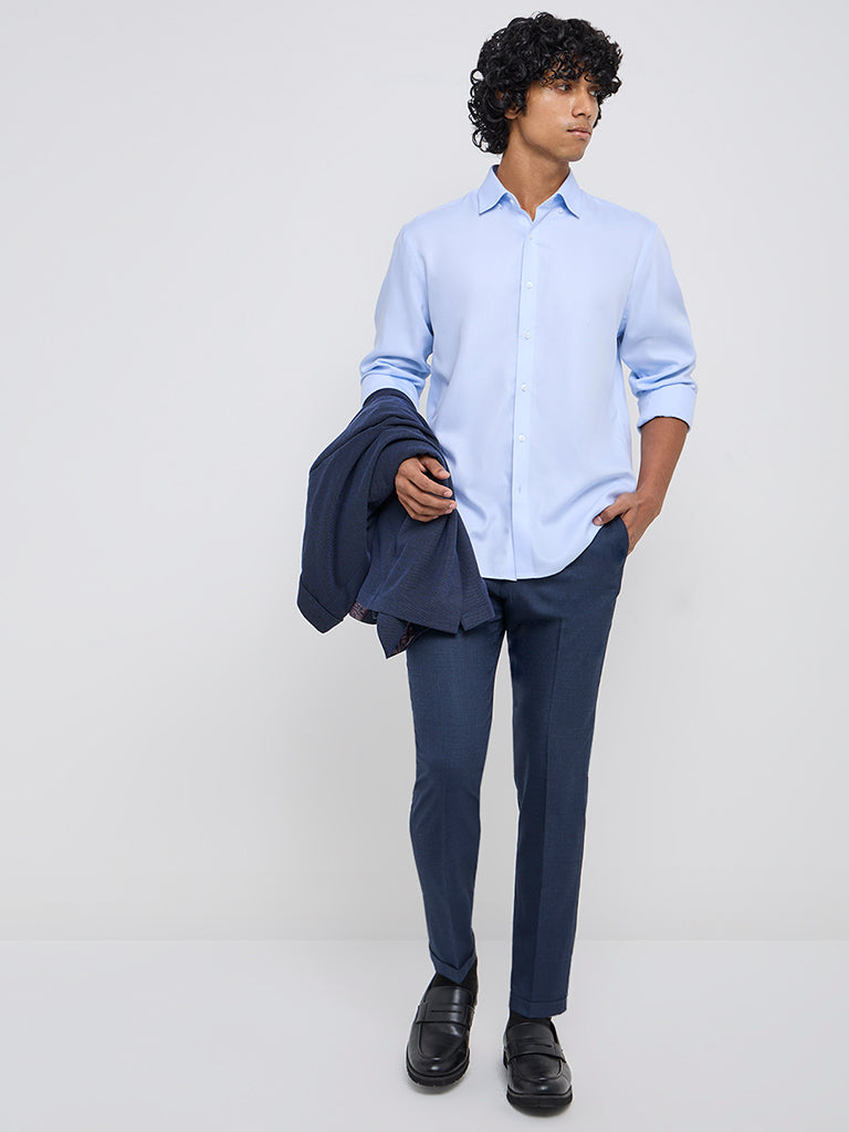 WES Formals presents this blue shirt offering a slim-fit experience. The pure cotton formal wear boats a buttoned collar leading to a button down style and full sleeves.