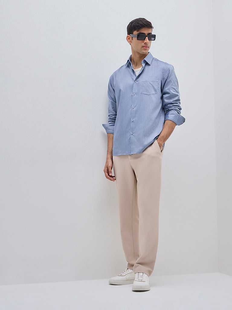 Designed in a slim-fit profile. this blue shirt by WES Formals is an exceptional pick. Tailored with soft and breathable fabric. it includes a spread collar. button down style. full sleeves and a front square pocket.