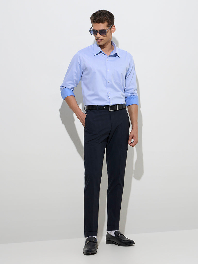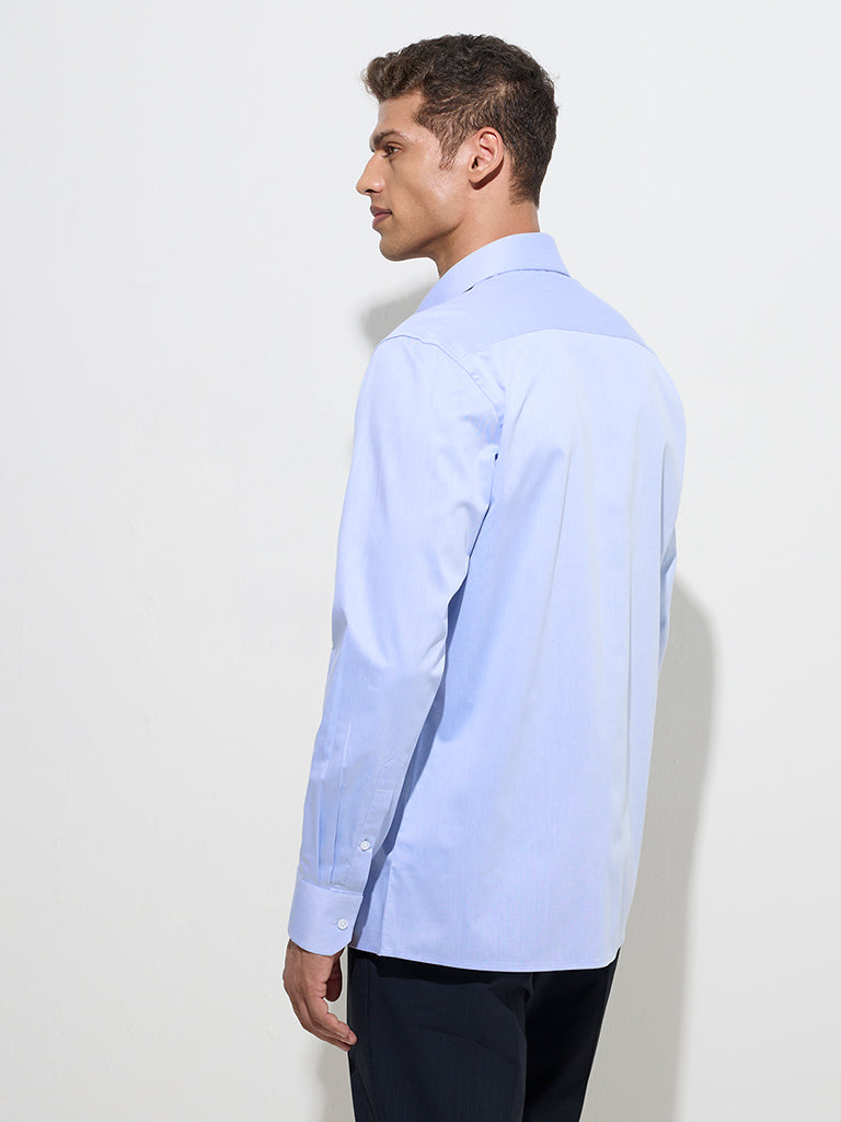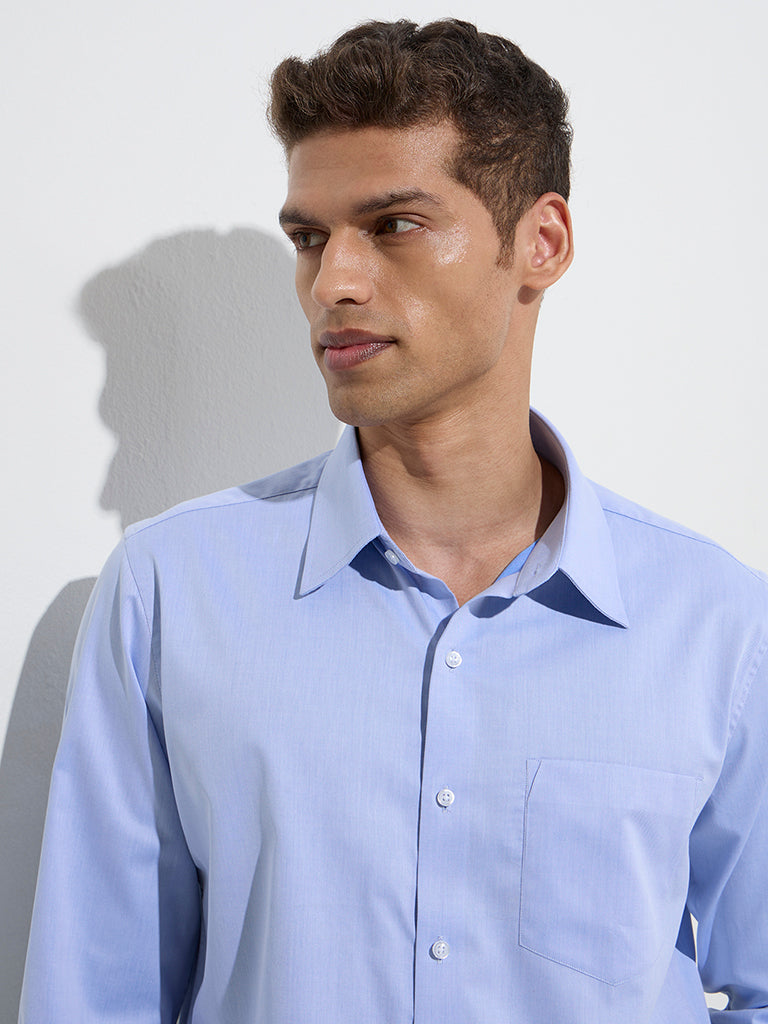 This blue shirt from WES Formals is tailored in a slim-fit silhouette for a sharp. refined look. Constructed from pure cotton. it features a classic collar. a button placket. full sleeves. and a chest pocket for a timeless touch.