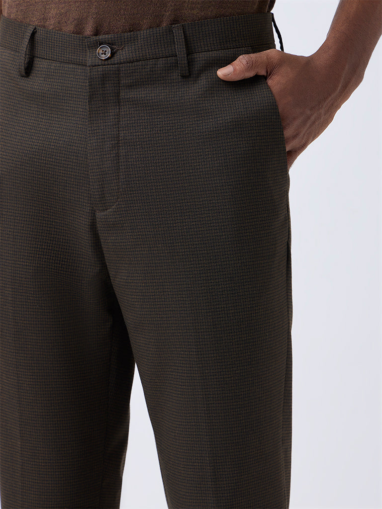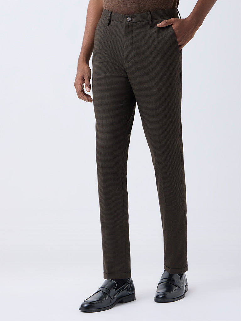WES Formals Brown Checkered Slim-Fit Mid-Rise Trousers