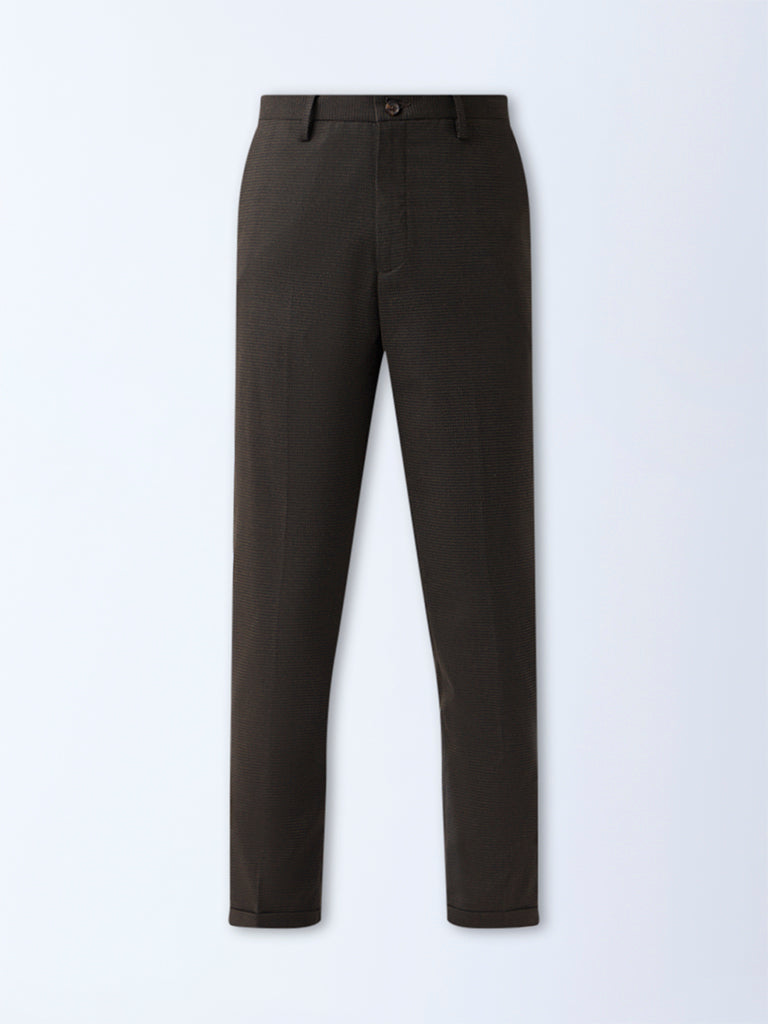 WES Formals presents these brown trousers with a mid-rise waistband. button fastening. zip fly and belt loops. Crafted from a soft. breathable fabric. they showcase checkered patterns on a carrot-fit silhouette. A polished staple that complements your everyday formal rotation with ease.