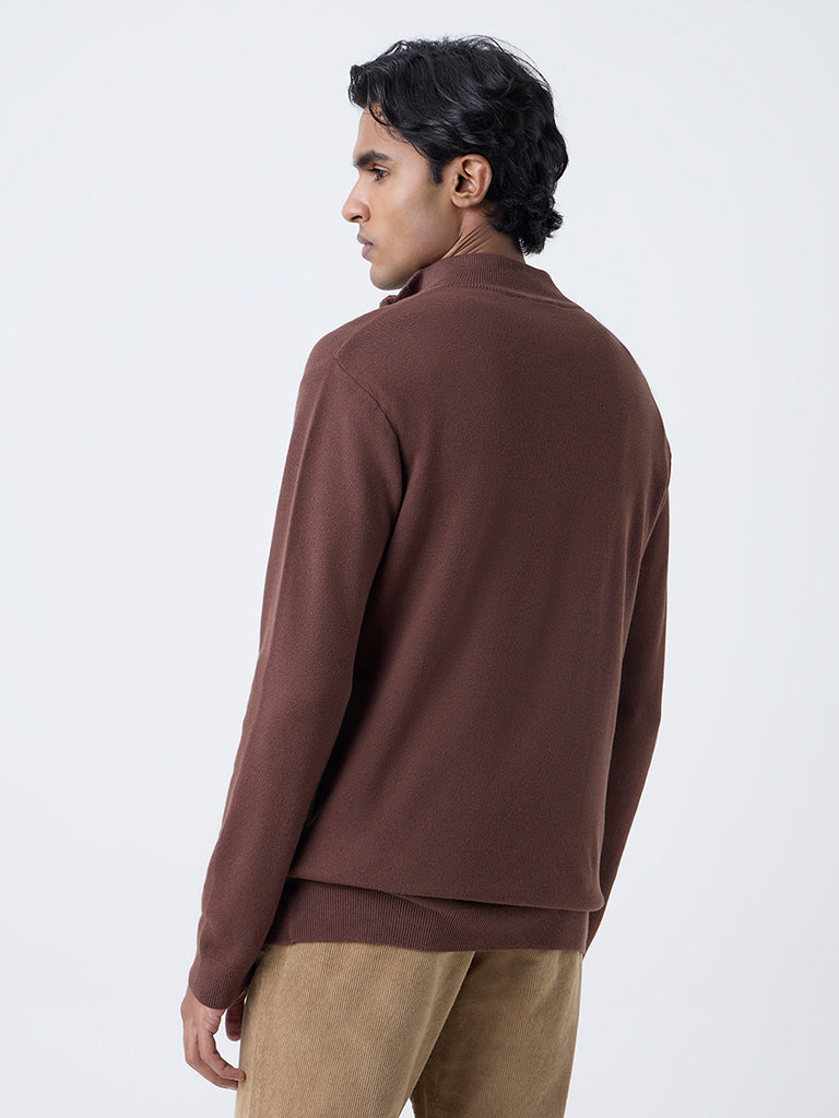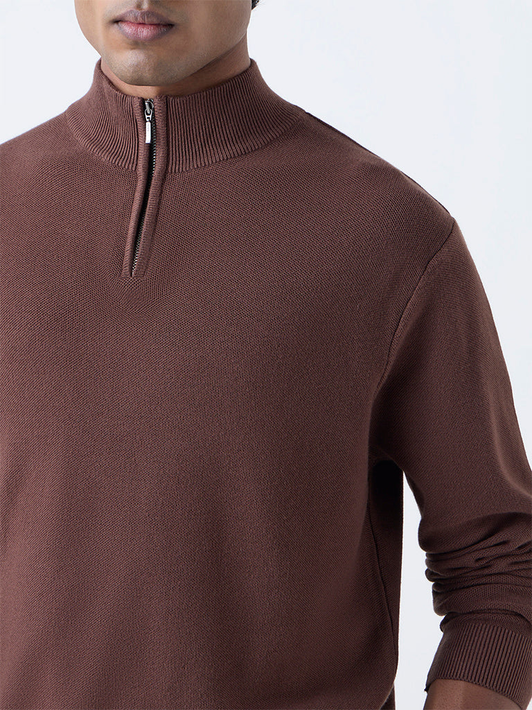 WES Formals Brown Knit-Textured Slim-Fit Sweater