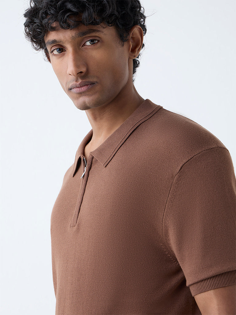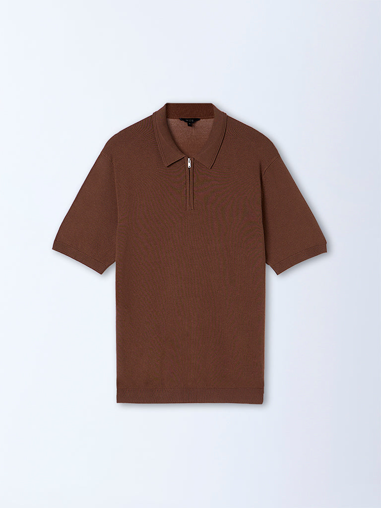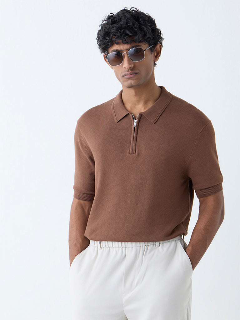 WES Formals Brown Relaxed-Fit Quarter-Zip Cotton-Blend Polo T-Shirt