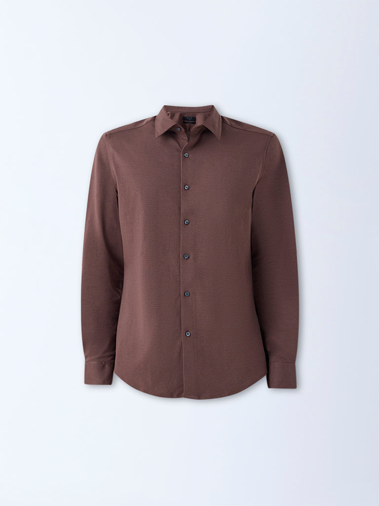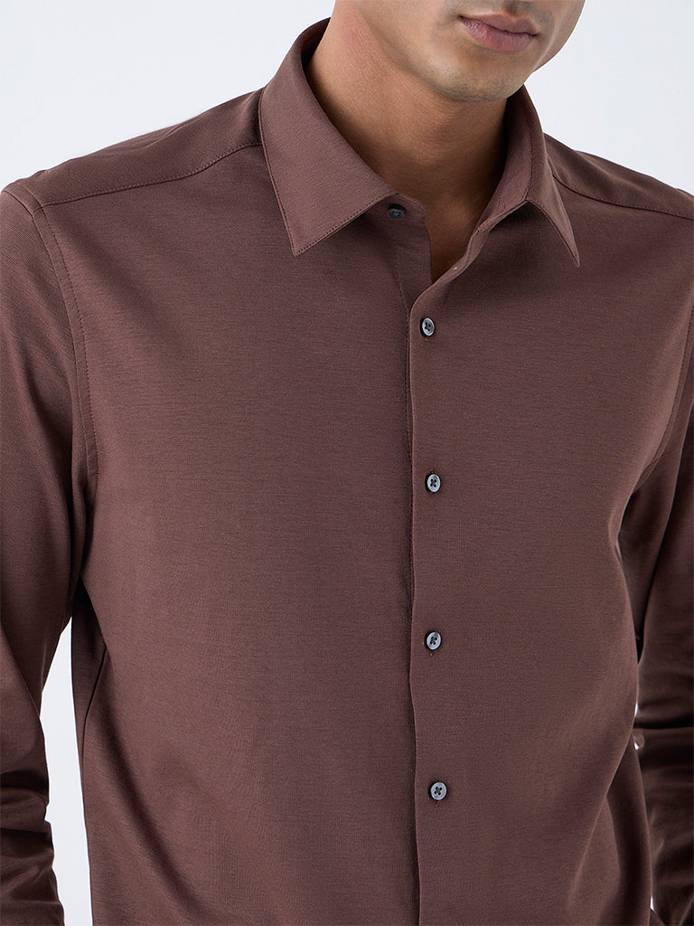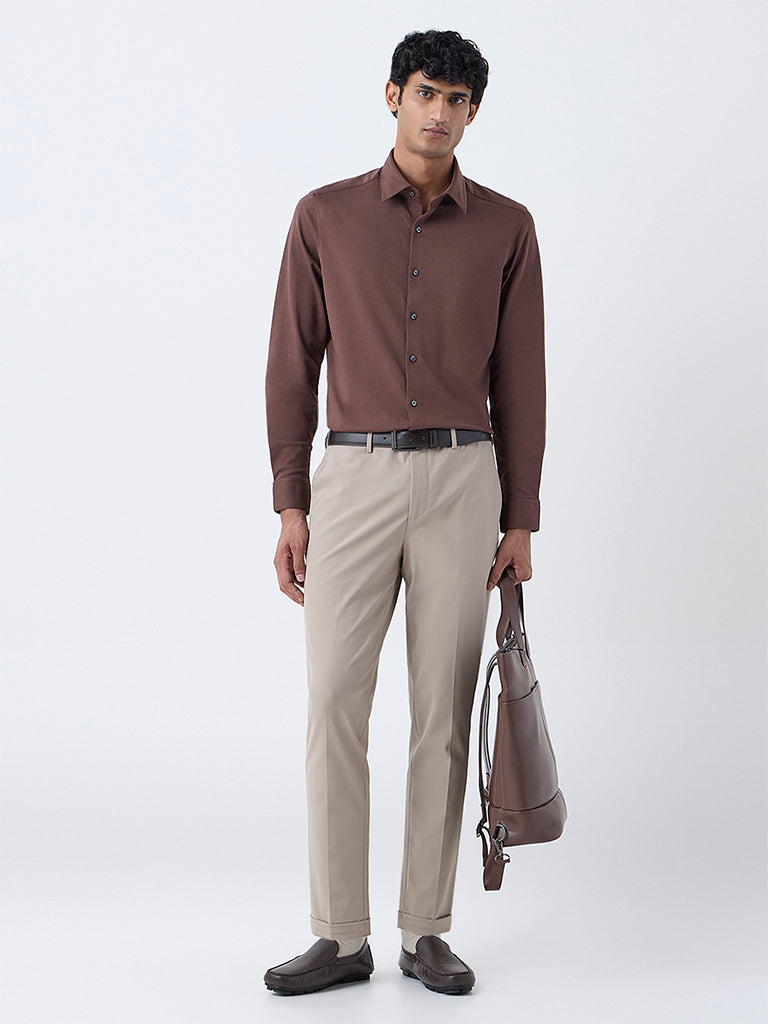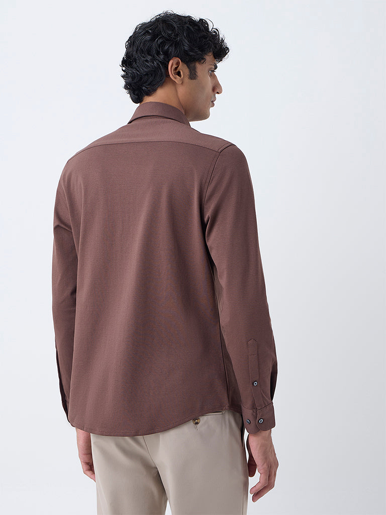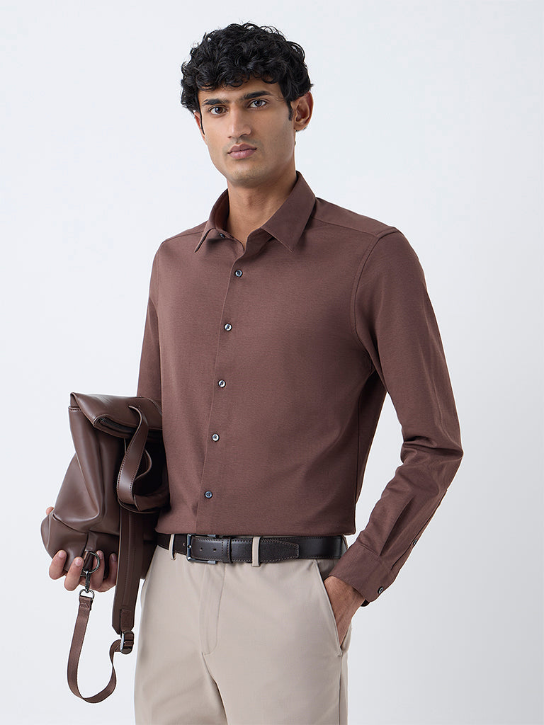 WES Formals presents this brown shirt. carved in a relaxed silhouette from a soft. premium-blend fabric with a smooth feel. Designed with a semi-spread collar. full sleeves and a button-up front. it serves as a refined staple for both office wear and formal occasions.