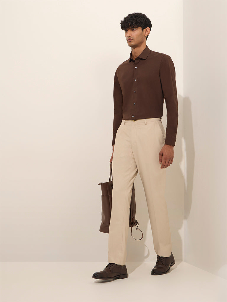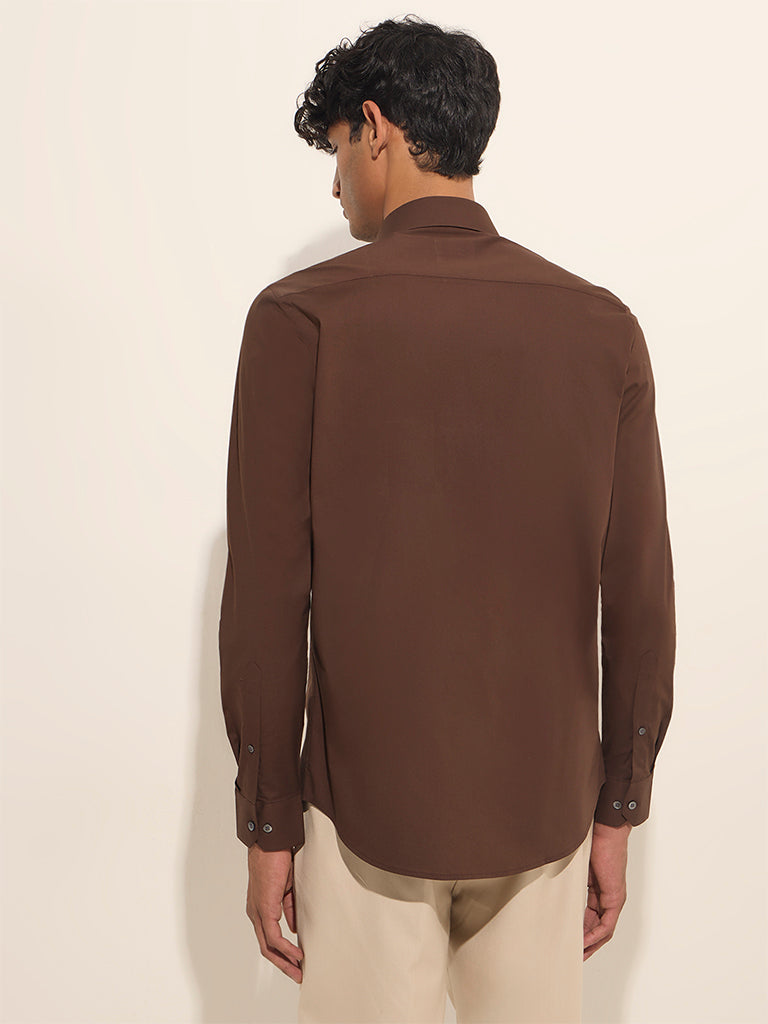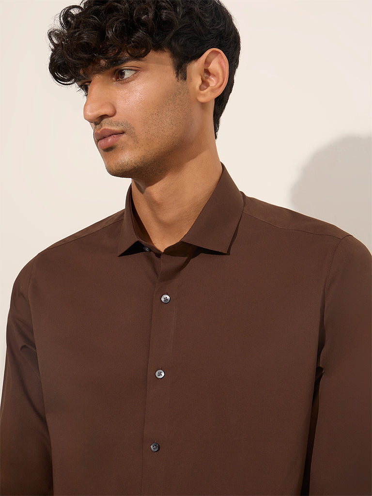 Refine your formal look with this brown slim-fit shirt from WES Formals. Crafted from high-quality fabric. it features a sleek spread collar. long sleeves. and a button-down front for a sophisticated finish.