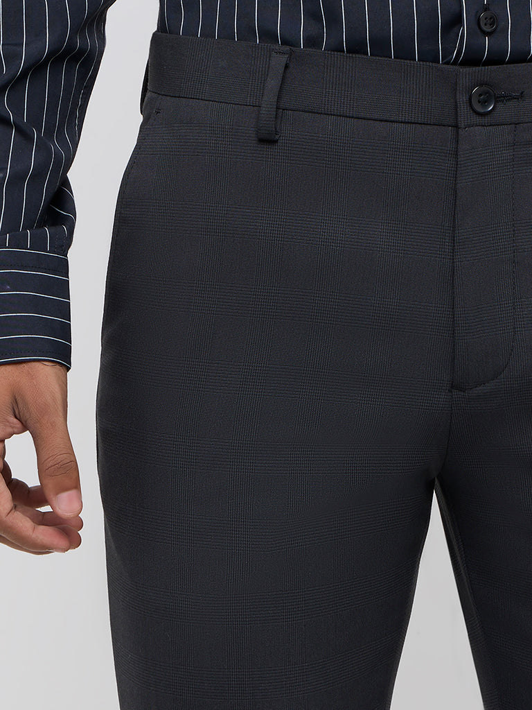 These charcoal trousers by WES Formals features subtle checkered print. They carved in trendy carrot-fit design and offers a mid-rise coverage. The garment is completed with buttoned waistband. zipper fly. belt loops and multiple pockets.