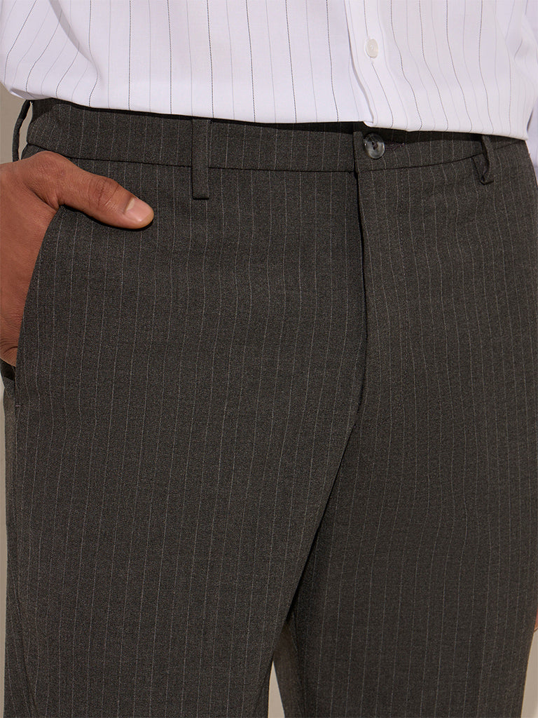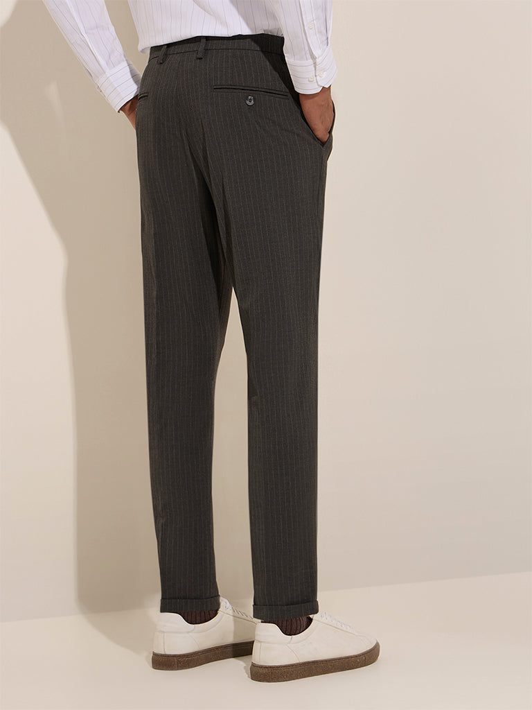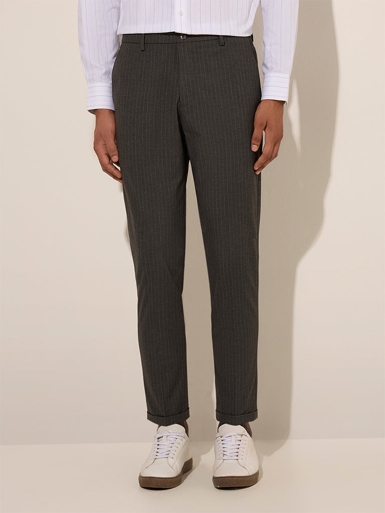 WES Formals Charcoal Pinstriped Mid-Rise Slim-Fit Trousers