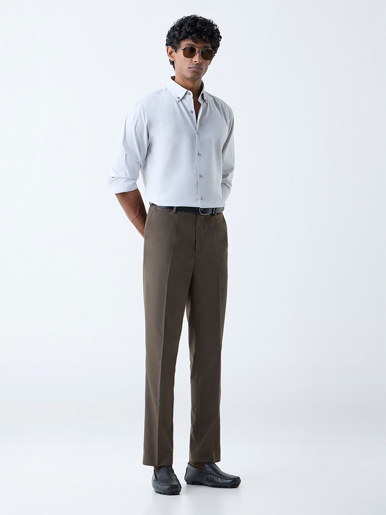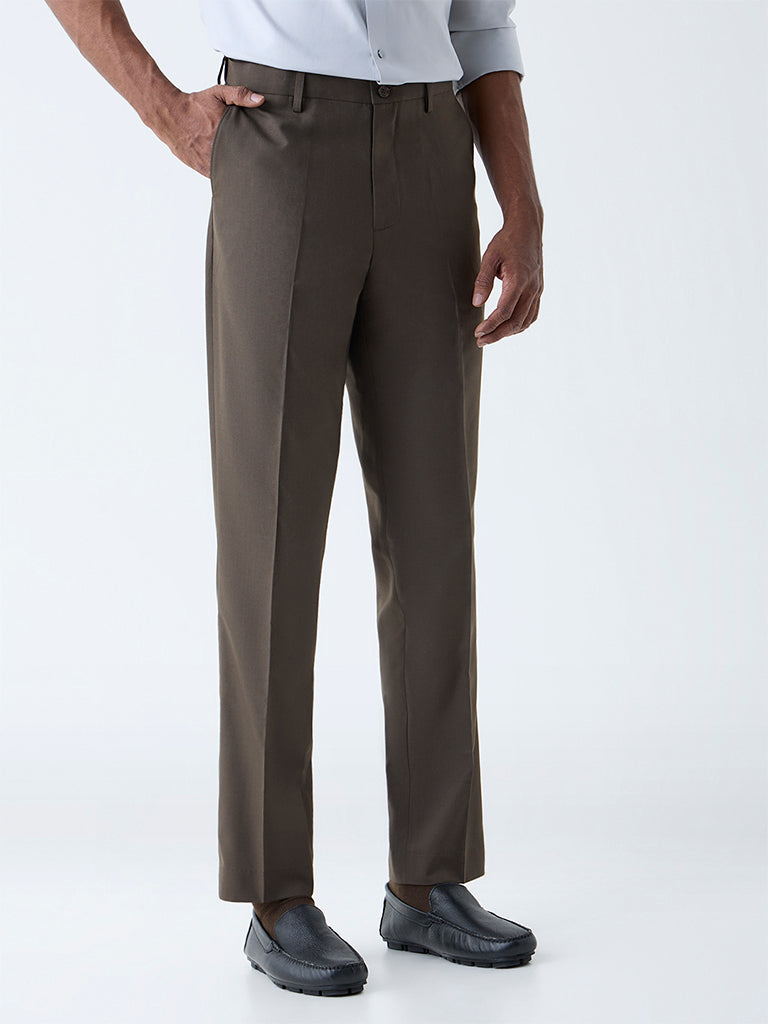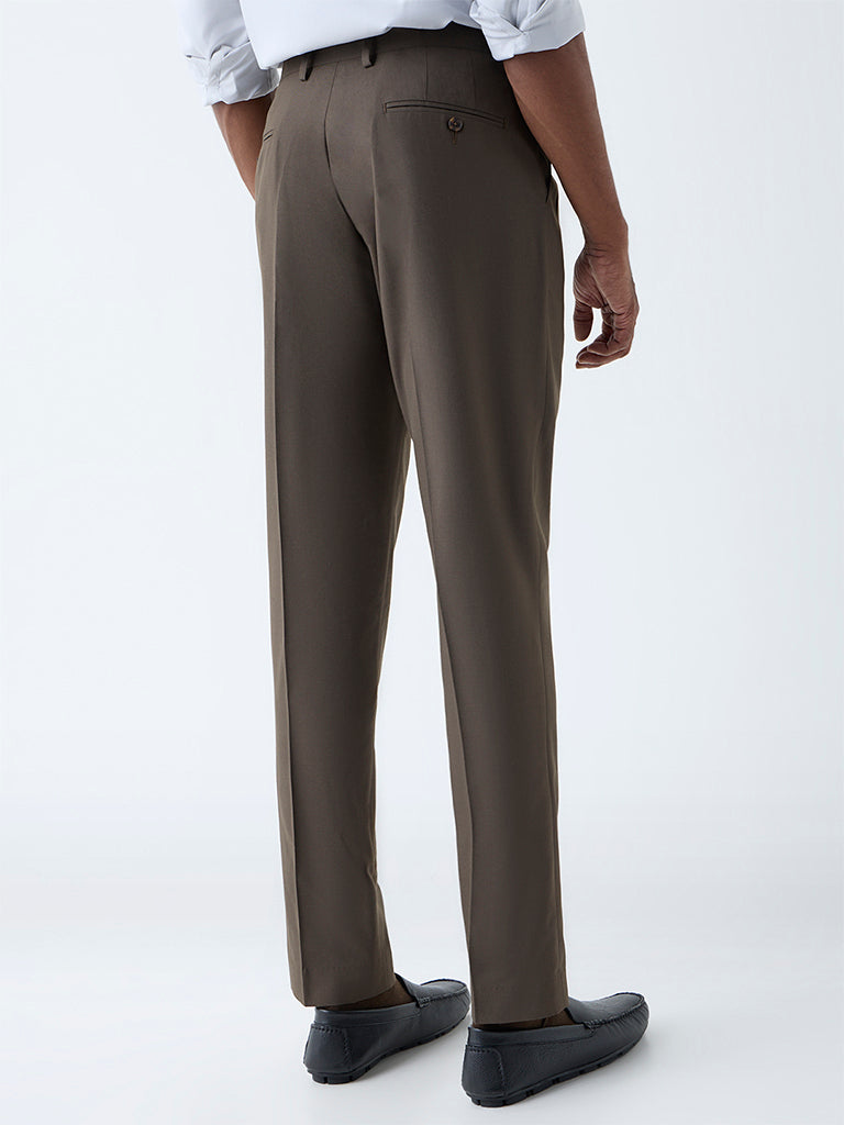 WES Formals Dark Brown Slim-Fit Mid-Rise Trousers