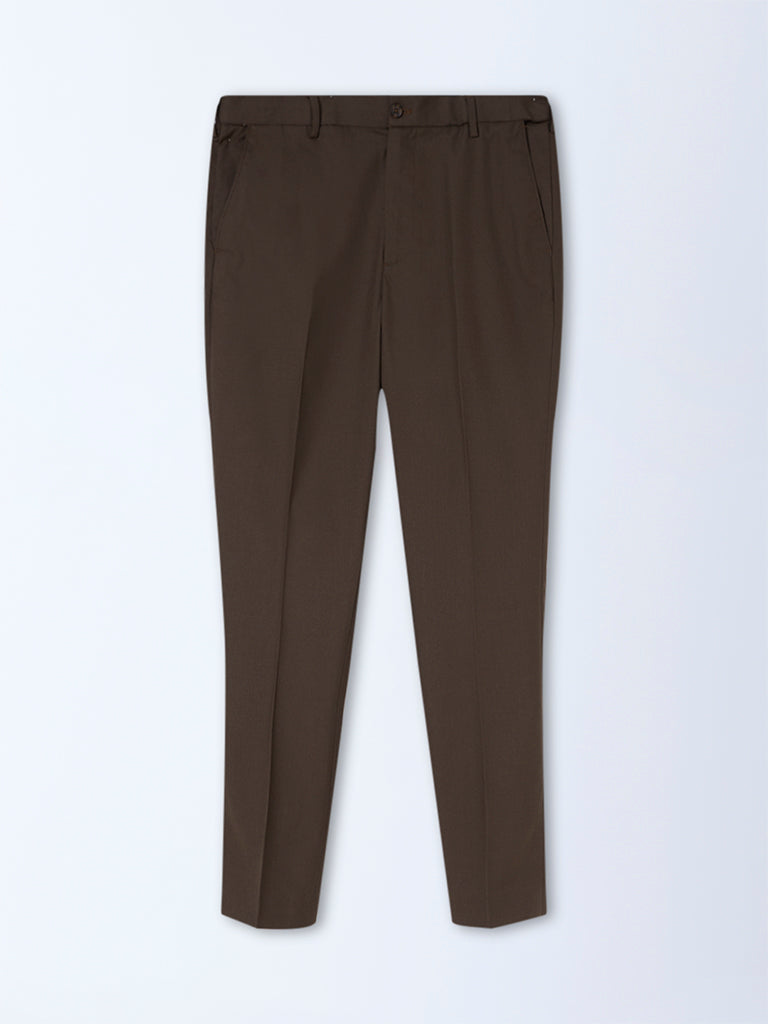 Revamp your formal contingent with these dark brown slim-fit trousers from WES Formals. Tailored from a lightweight fabric. the mid-rise design is detailed with a structured waistband. button fastening. belt loops and a zip fly for a neat finish. Functional pockets lend everyday ease. while the versatile silhouette delivers polished style with lasting comfort.