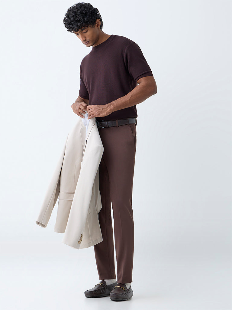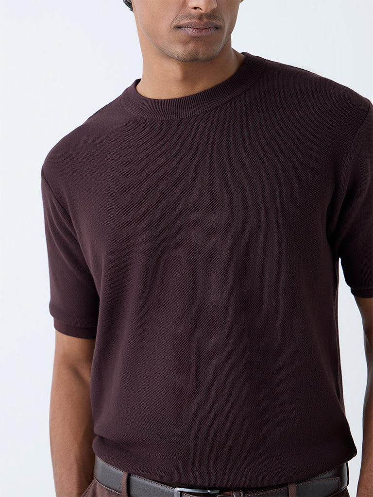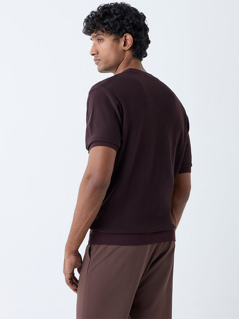 WES Formals Dark Brown Solid Slim-Fit T-Shirt