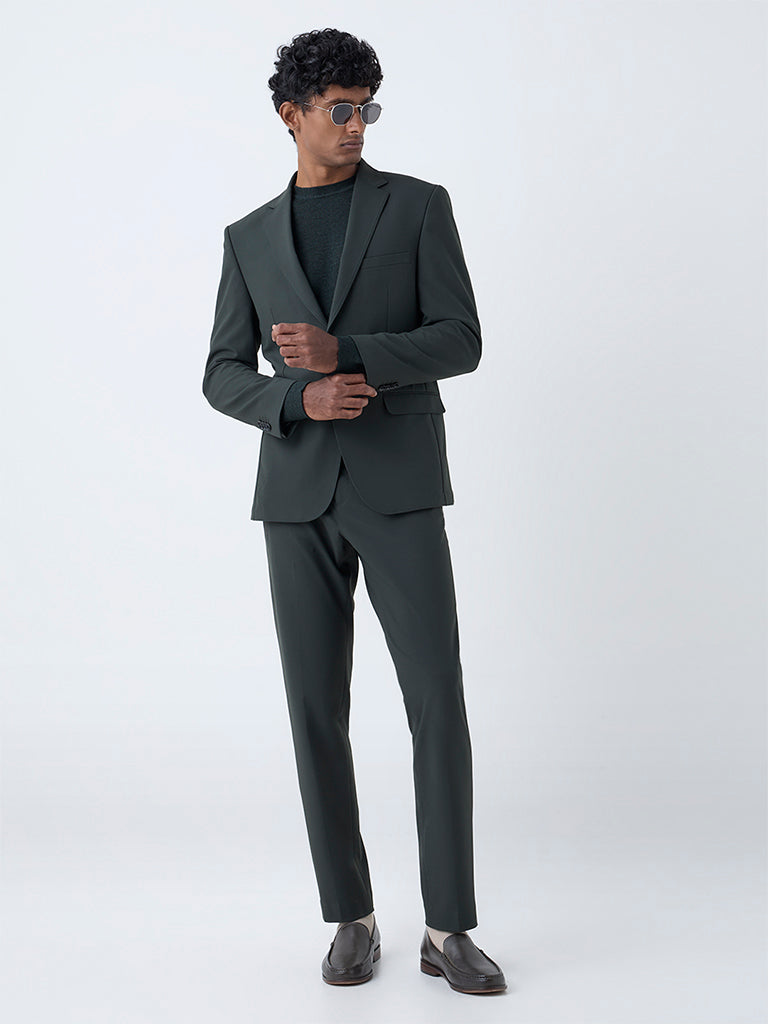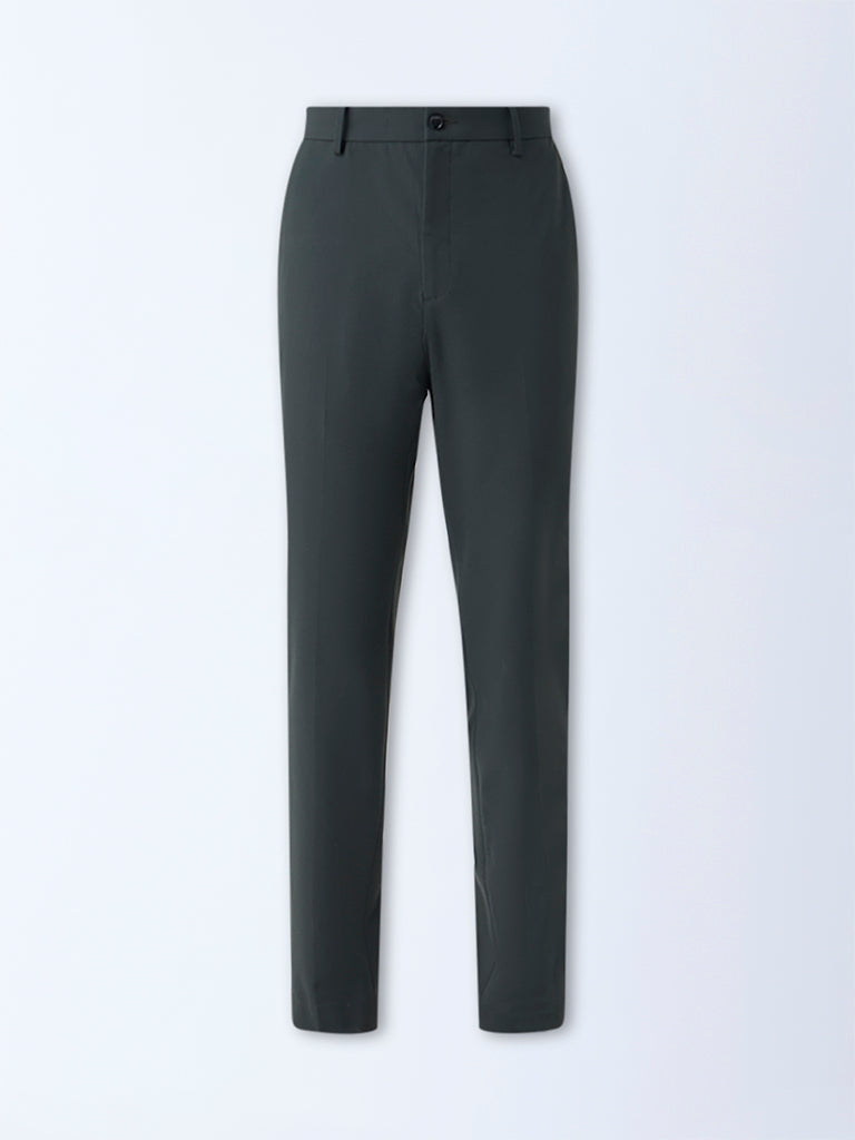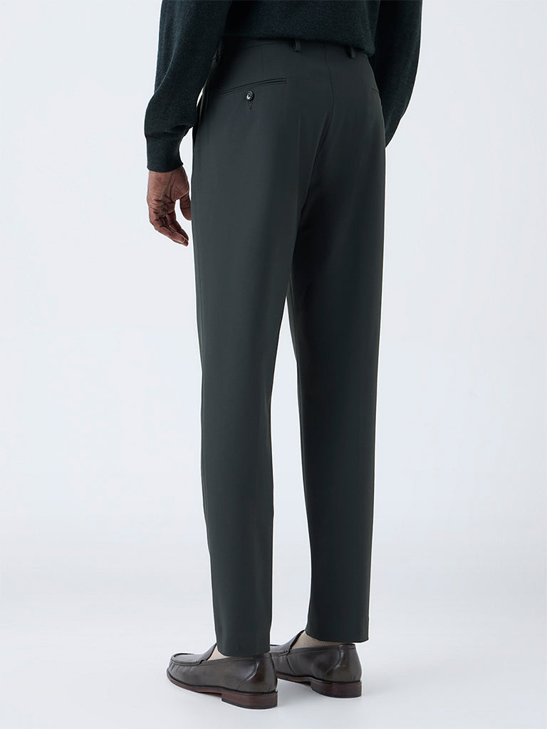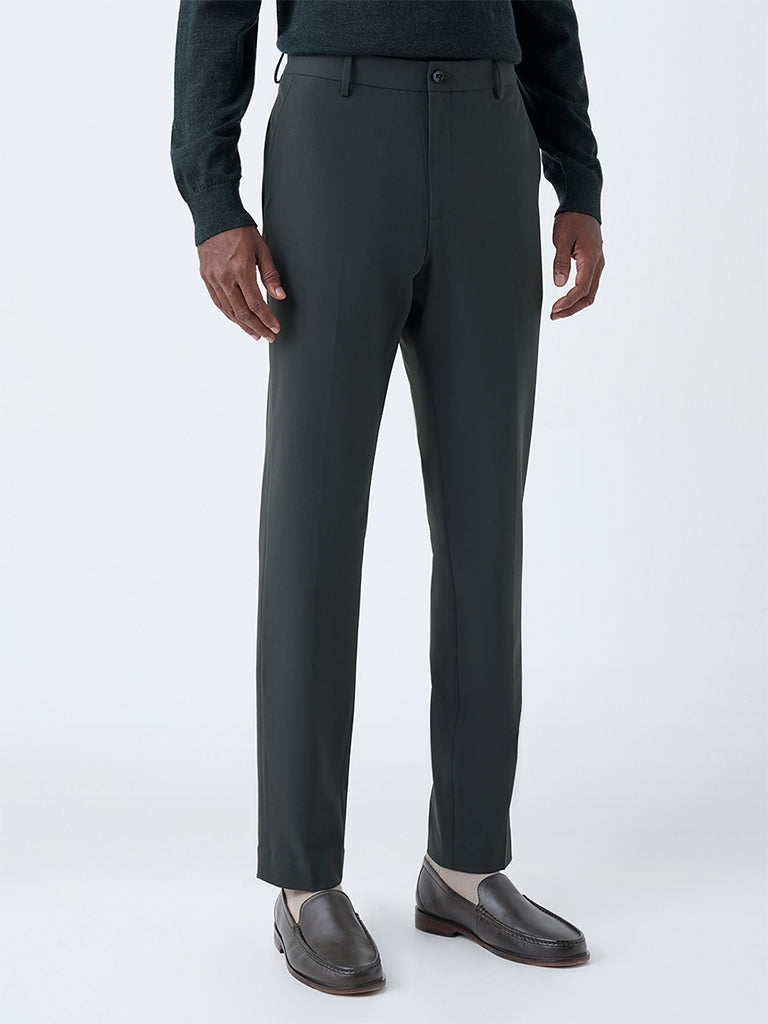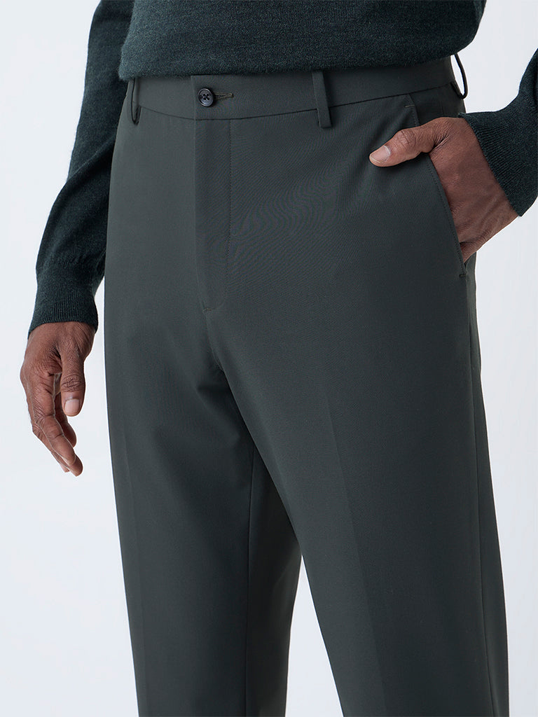 WES Formals Dark Green Solid Slim-Fit Mid-Rise Trousers