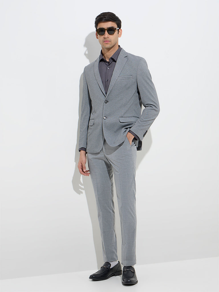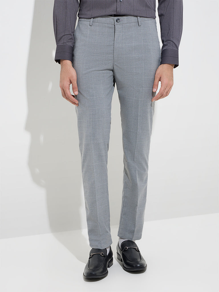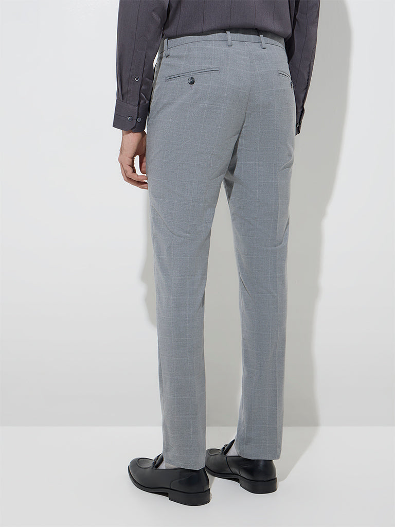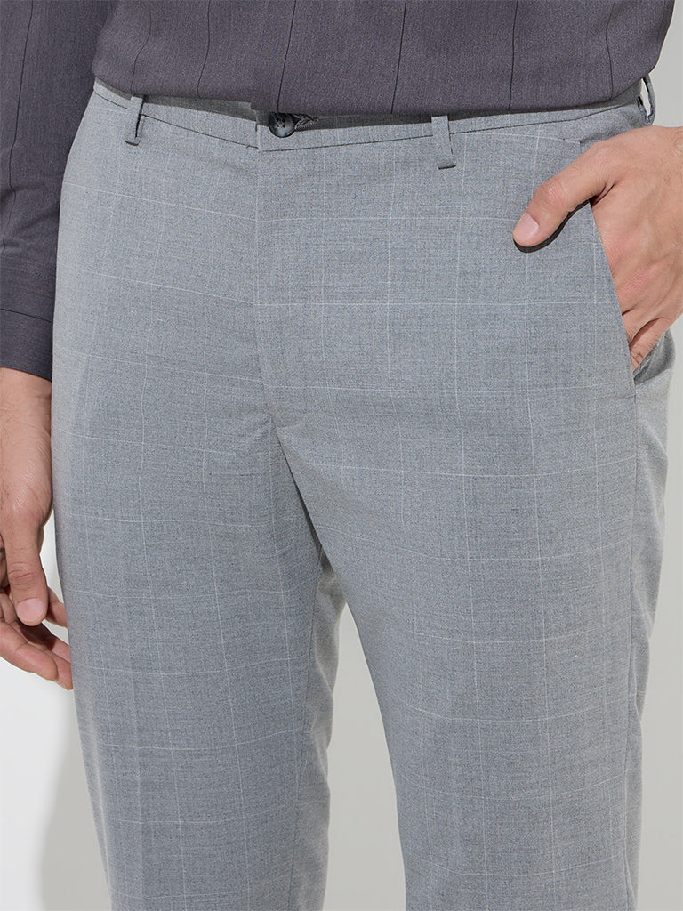 WES Formals Grey Checkered Ultra-Slim Fit Mid-Rise Trousers