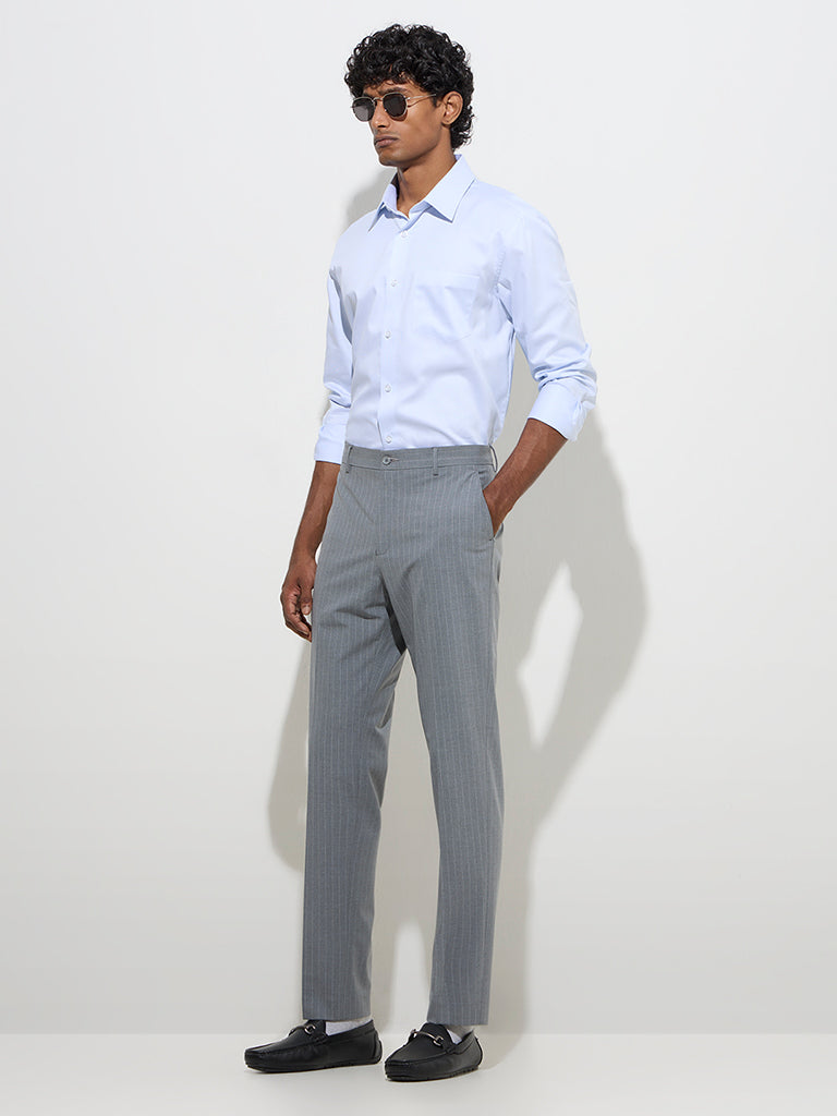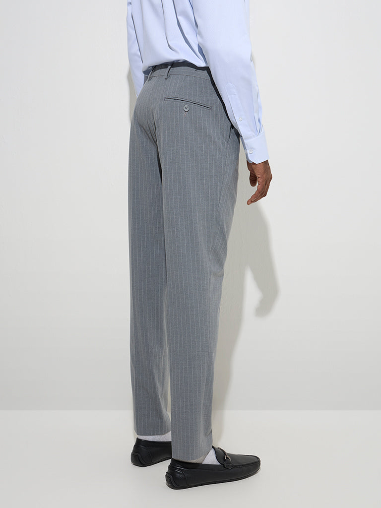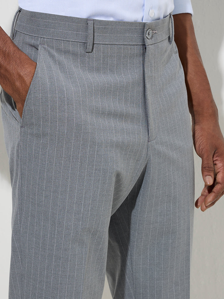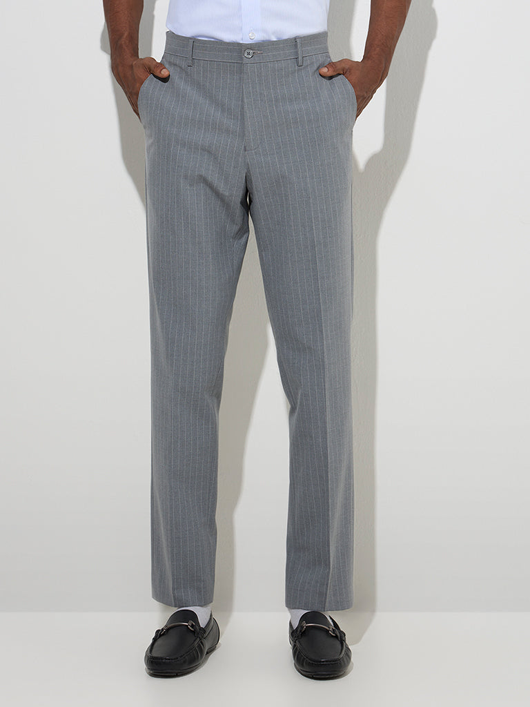 WES Formals Grey Pinstriped Slim-Fit Mid-Rise Trousers