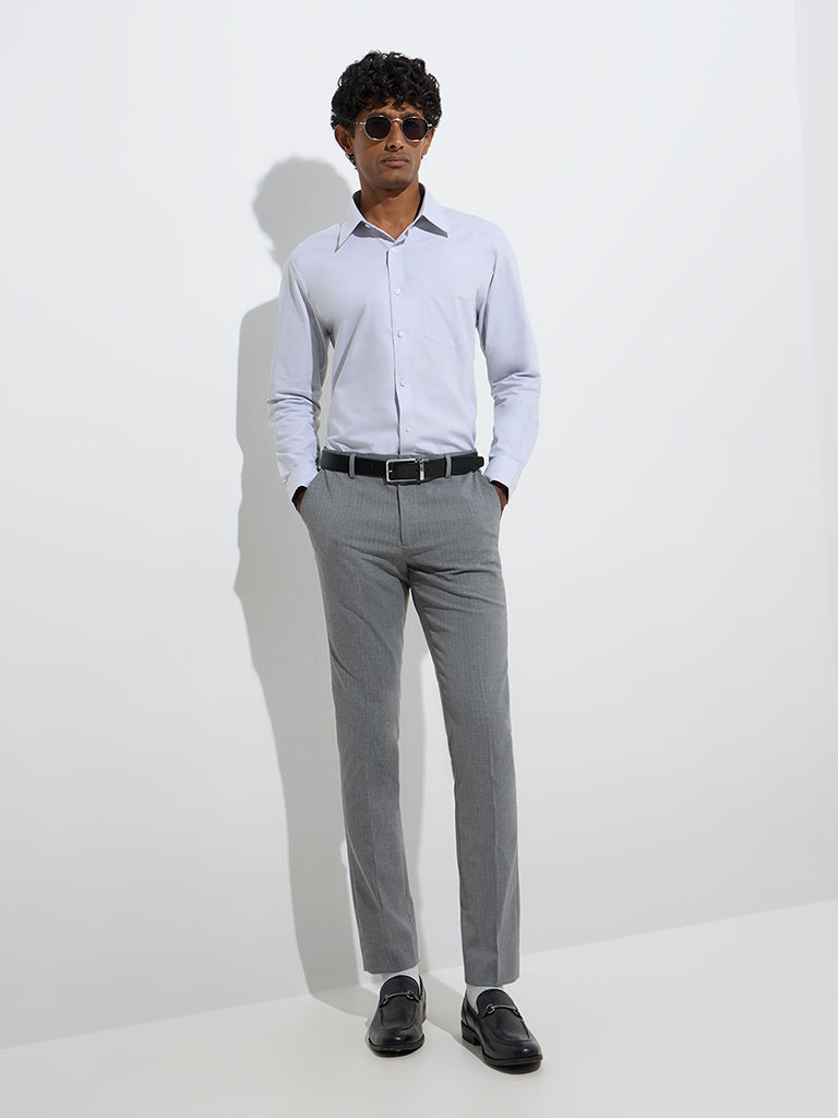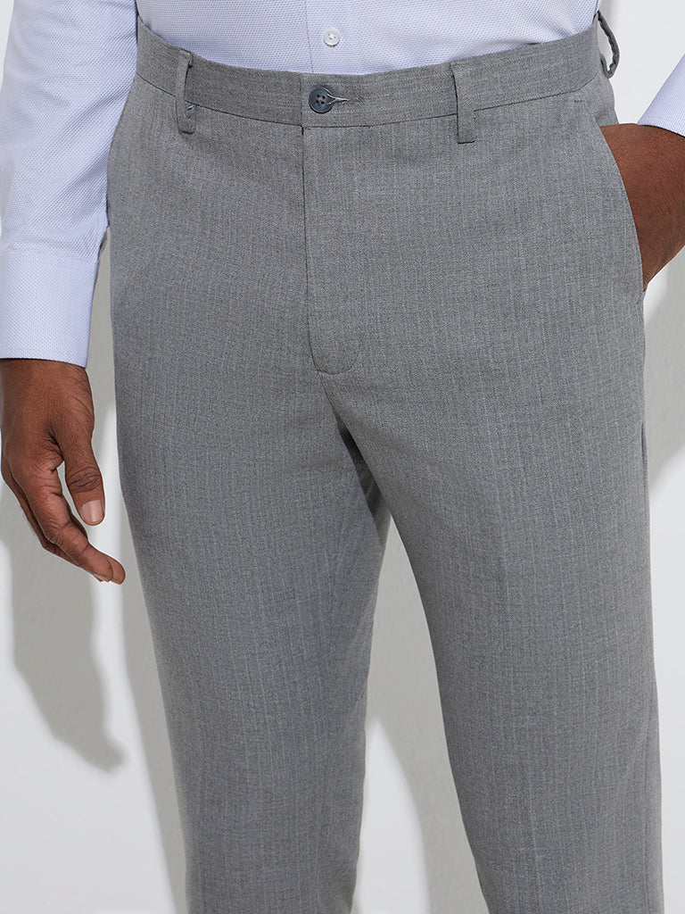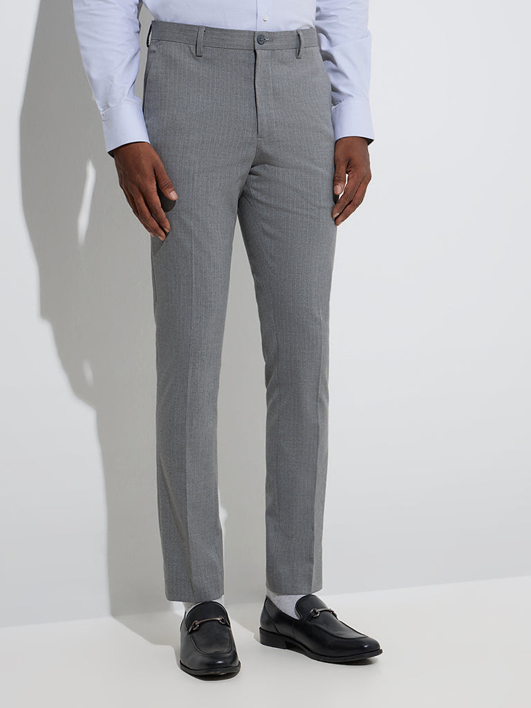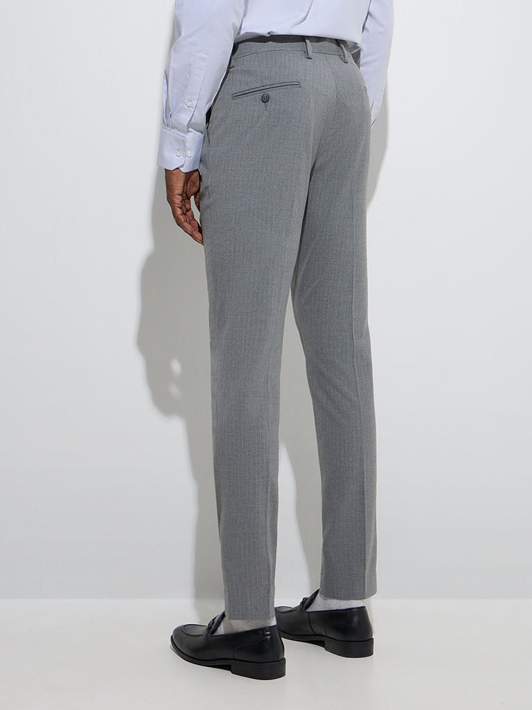 WES Formals Grey Self Ultra-Slim Fit Mid-Rise Trousers