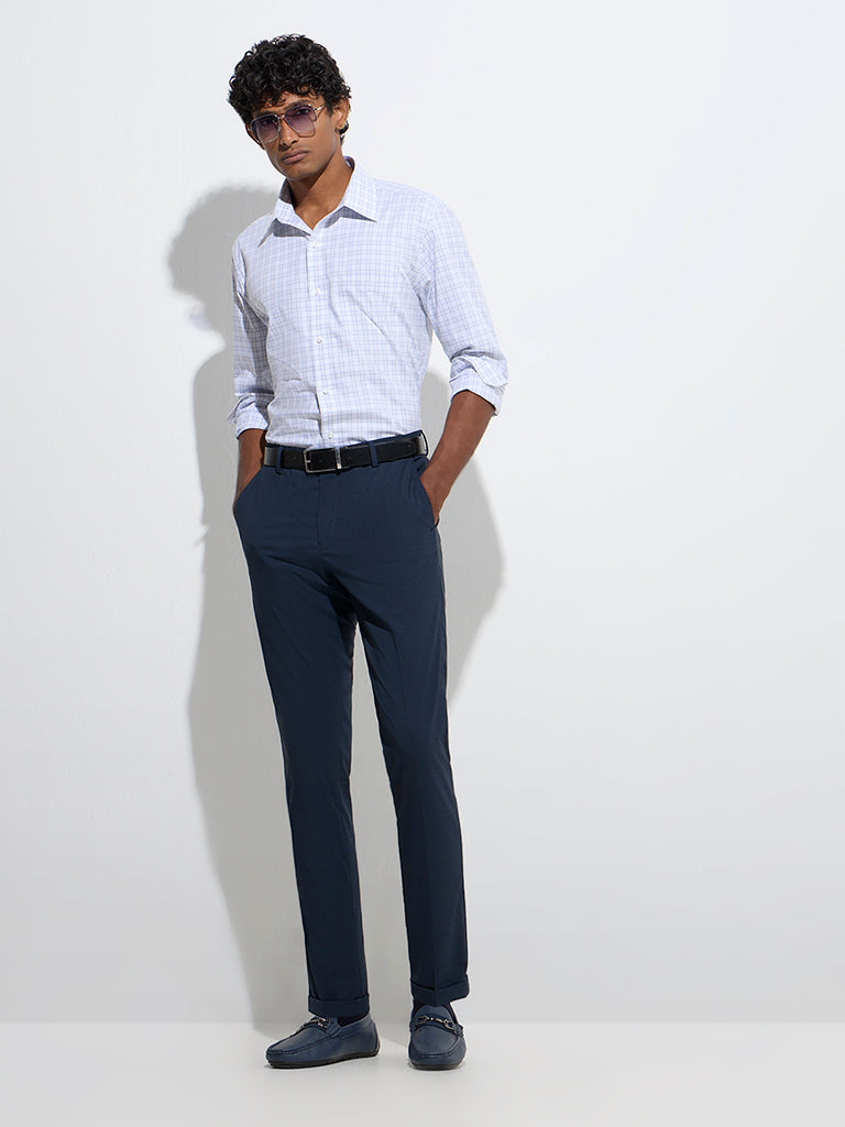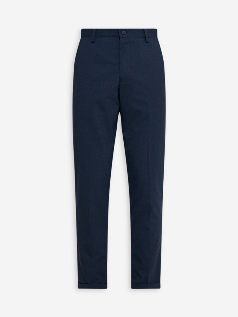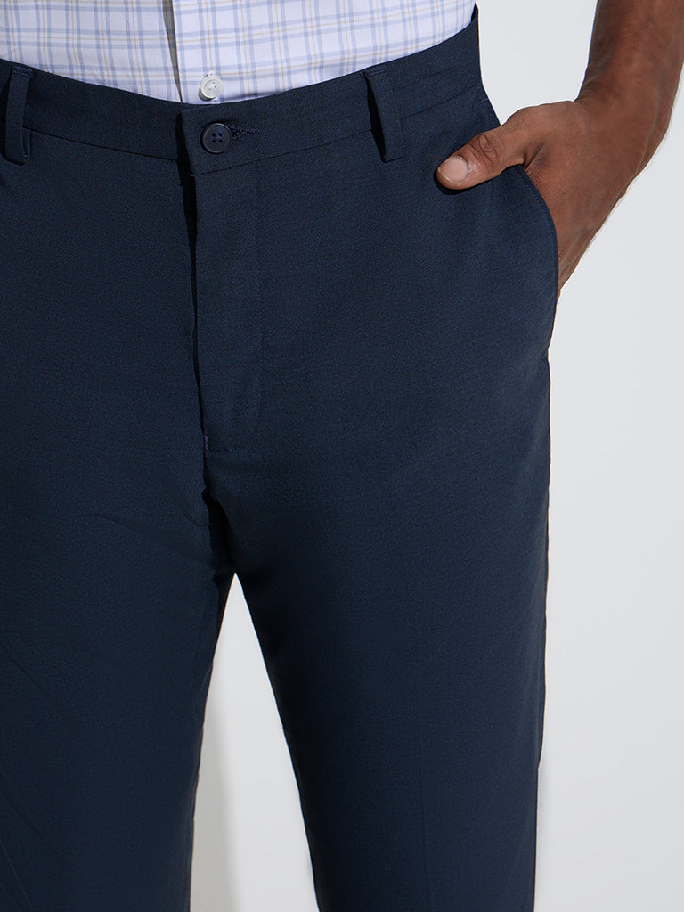 These indigo trousers from WES Formals are tailored in a contemporary carrot-fit silhouette. offering a refined balance of structure and comfort. Crafted from lightweight fabric. they feature a structured waistband. button fastening. zip fly. and belt loops for a polished finish. Complete with multiple functional pockets. this versatile pair is an effortless addition to your formal and smart-casual wardrobe.