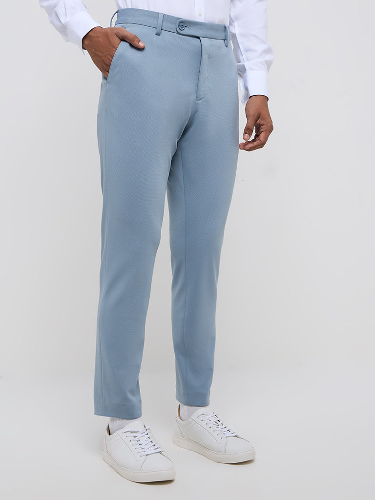Be the first to review “WES Formals Light Blue Slim-Tapered Mid-Rise Cotton-Blend Trousers”