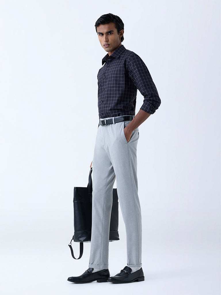 These light grey trousers from WES Formals offer a clean aesthetic with their solid finish and structured carrot-fit silhouette. Crafted from high-quality fabric. they’re detailed with a smooth buttoned waistband. zipper fly. belt loops. and multiple pockets.