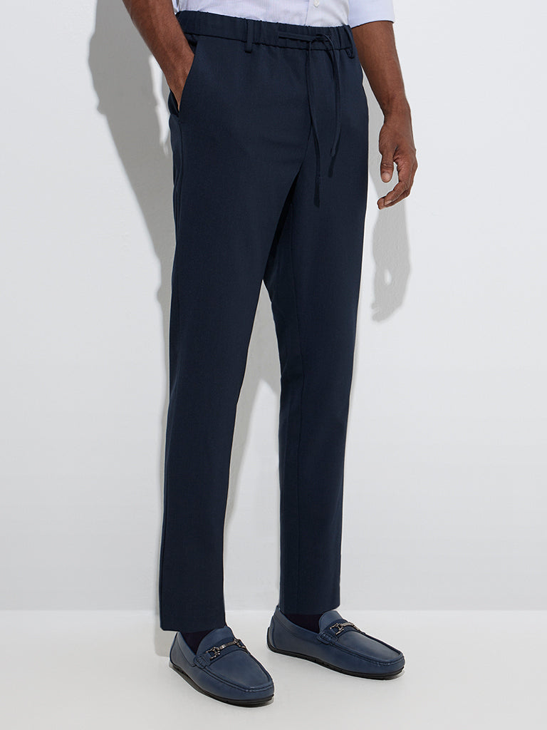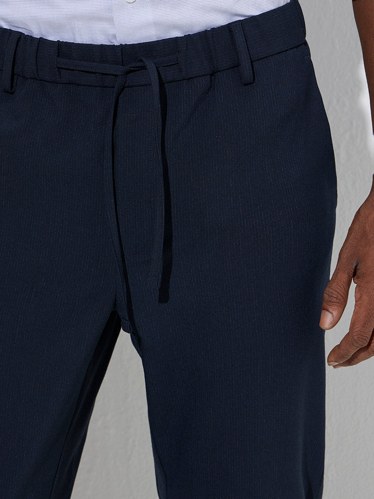 These navy trousers from WES Formals are fashioned in a slim-tapered fit and detailed with understated self-stripe prints for a polished look. Made from a breathable fabric. they offer all-day comfort and ease of movement. The elasticated waistband with adjustable drawstrings. belt loops. and multiple pockets ensures a blend of tailored style and everyday functionality.