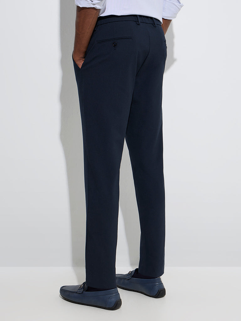 WES Formals Navy Self Slim-Fit Fit Mid-Rise Trousers