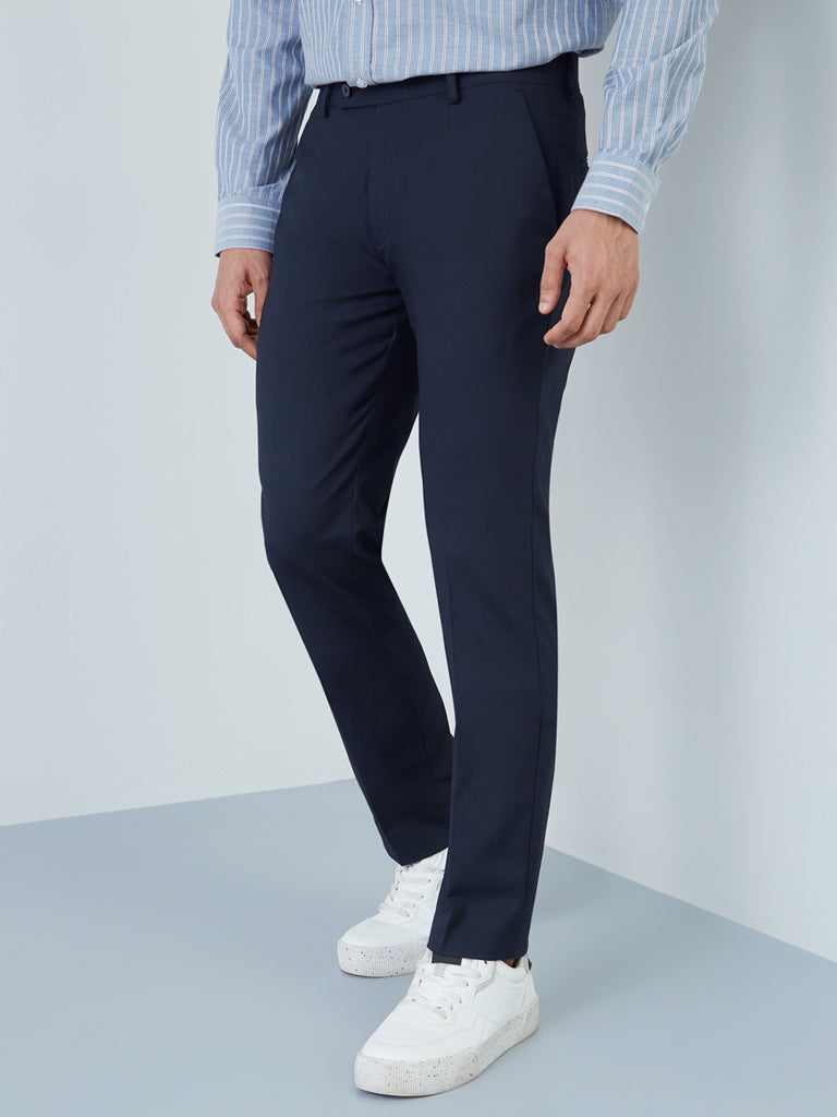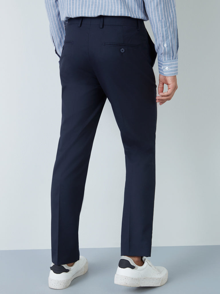 WES Formals Navy Slim-Fit Mid-Rise Trousers