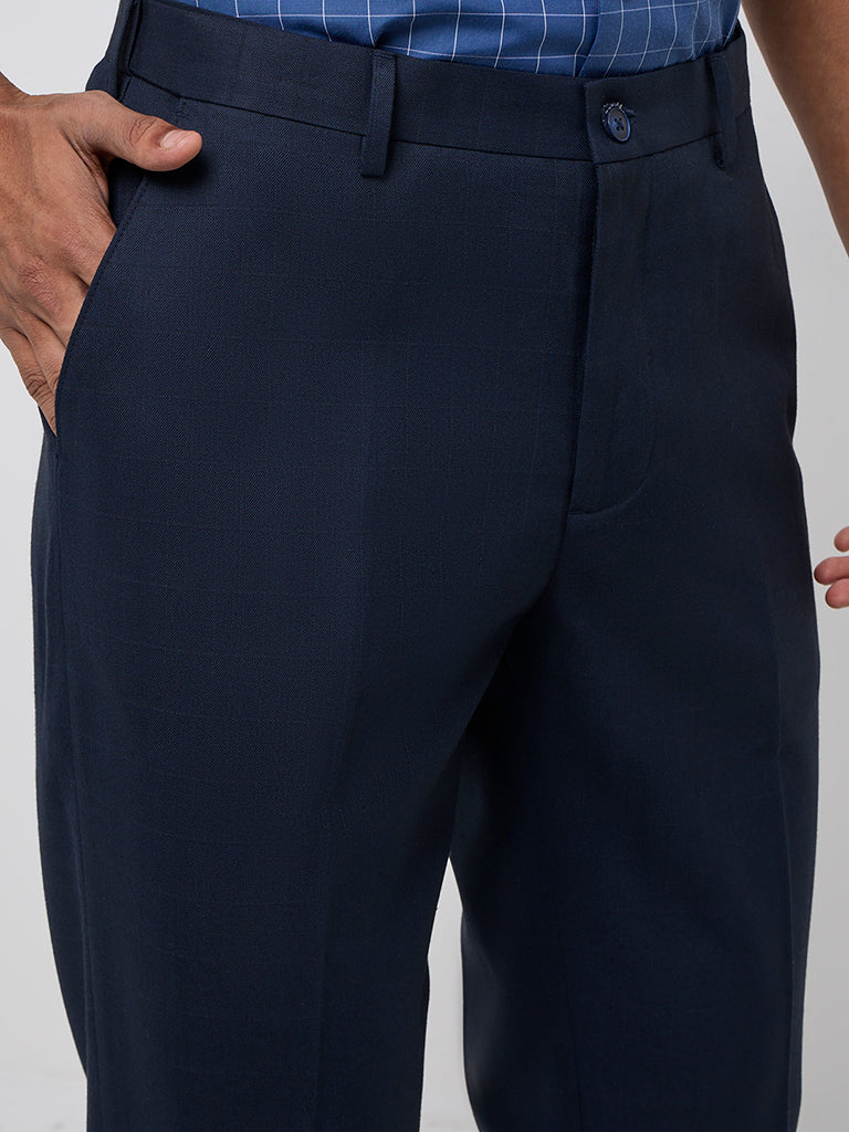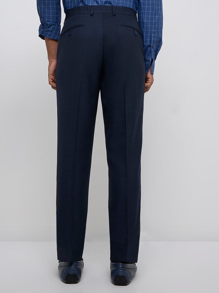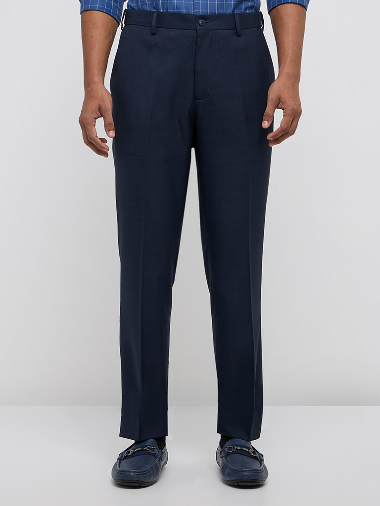 WES Formals Navy Solid Slim-Fit Mid-Rise Trousers