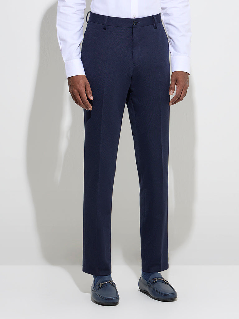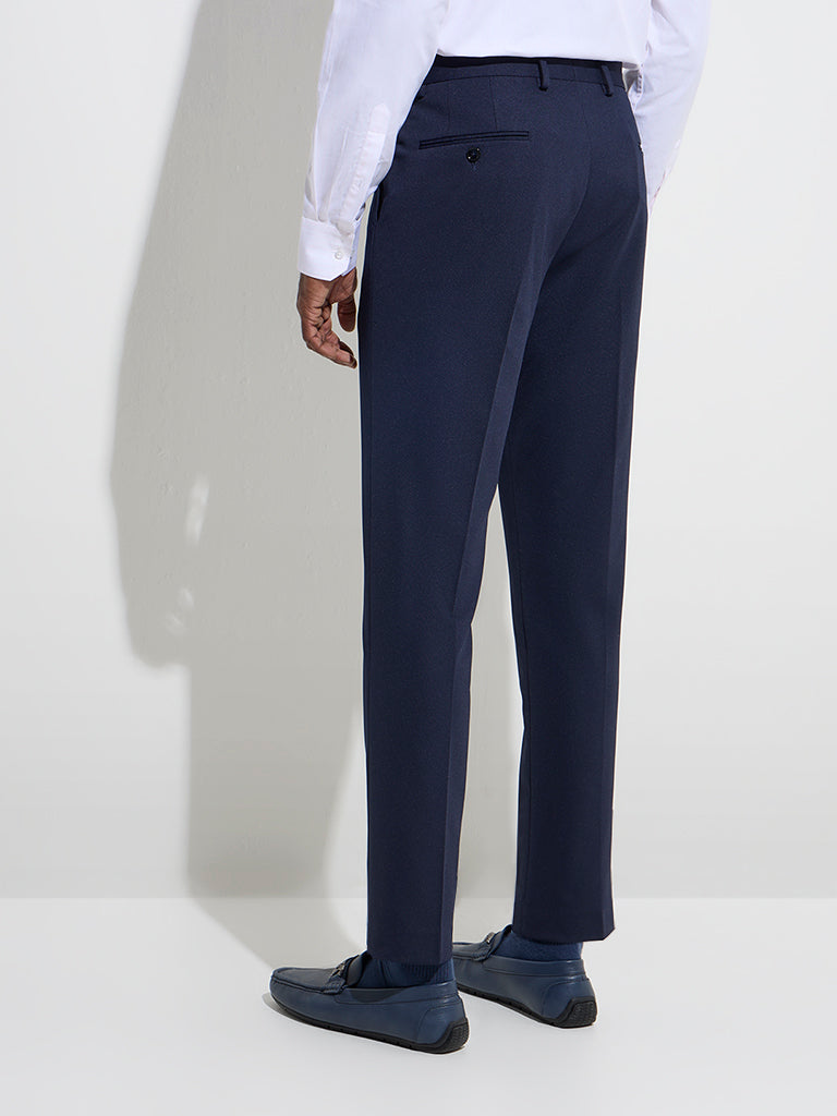 WES Formals Navy Solid Slim-Fit Mid-Rise Trousers